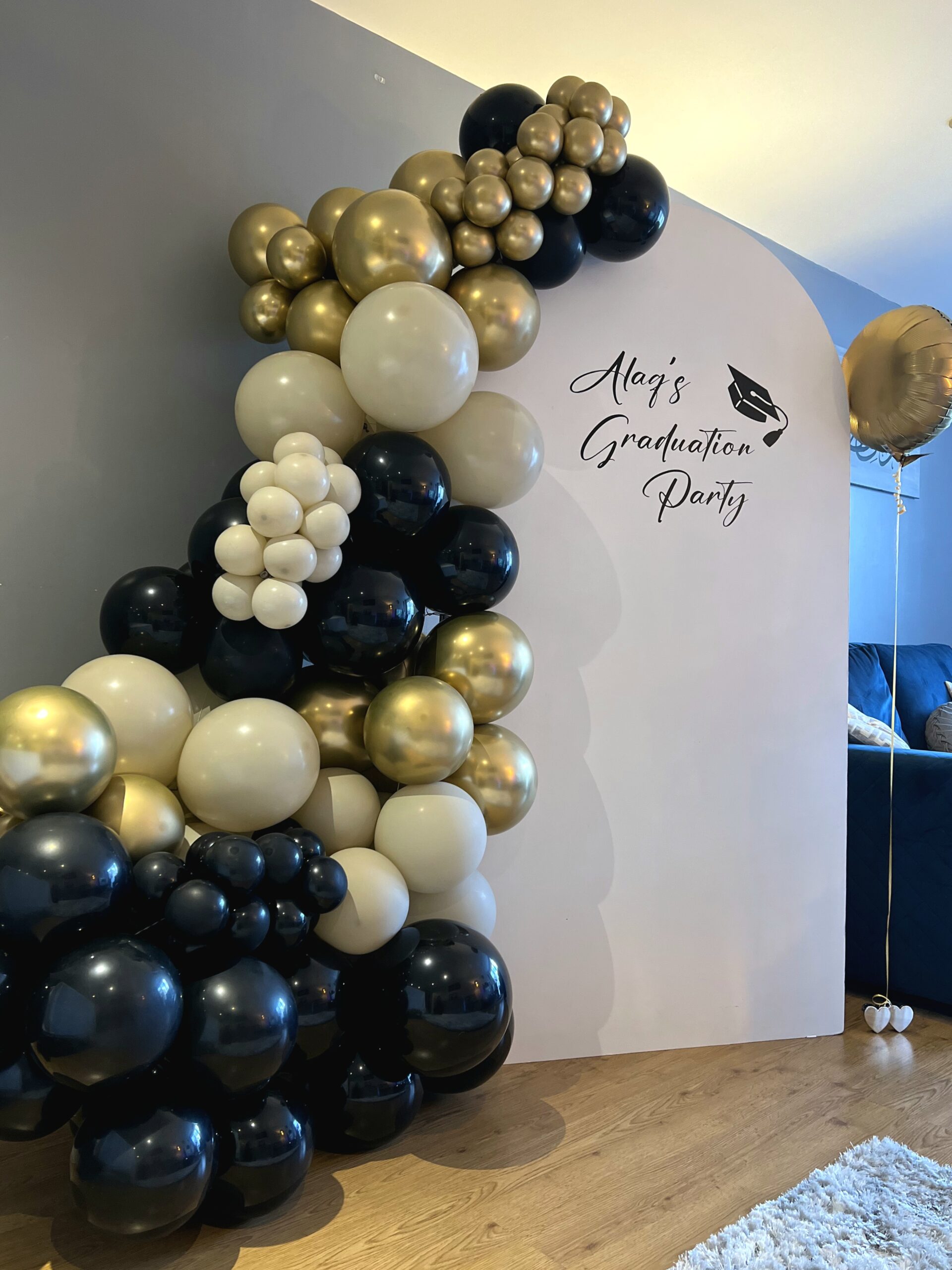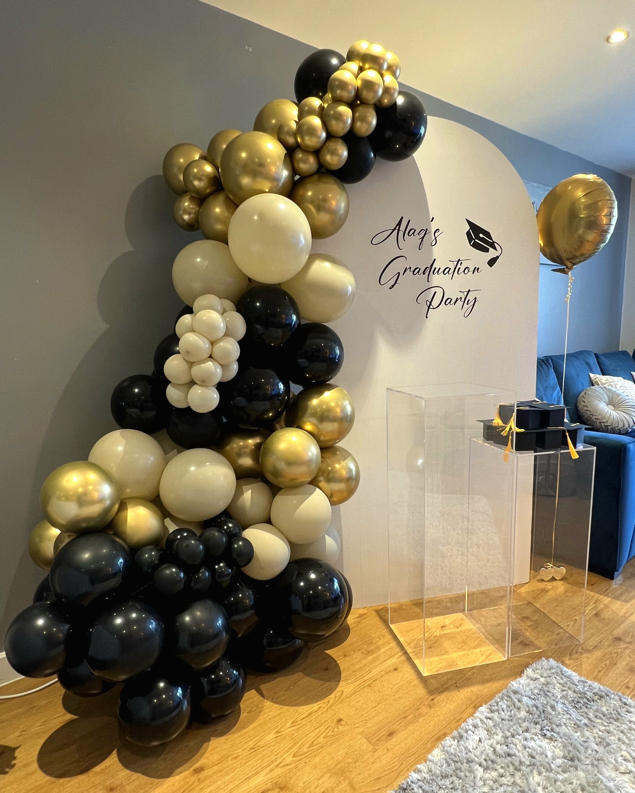 A personalised graduation backdrop with a cascading balloon garland created the perfect photo moment, while acrylic plinths, a gold console display and framed details added a refined touch. The colour palette blended celebration with class, creating a warm yet luxurious look that perfectly captured the milestone moment.