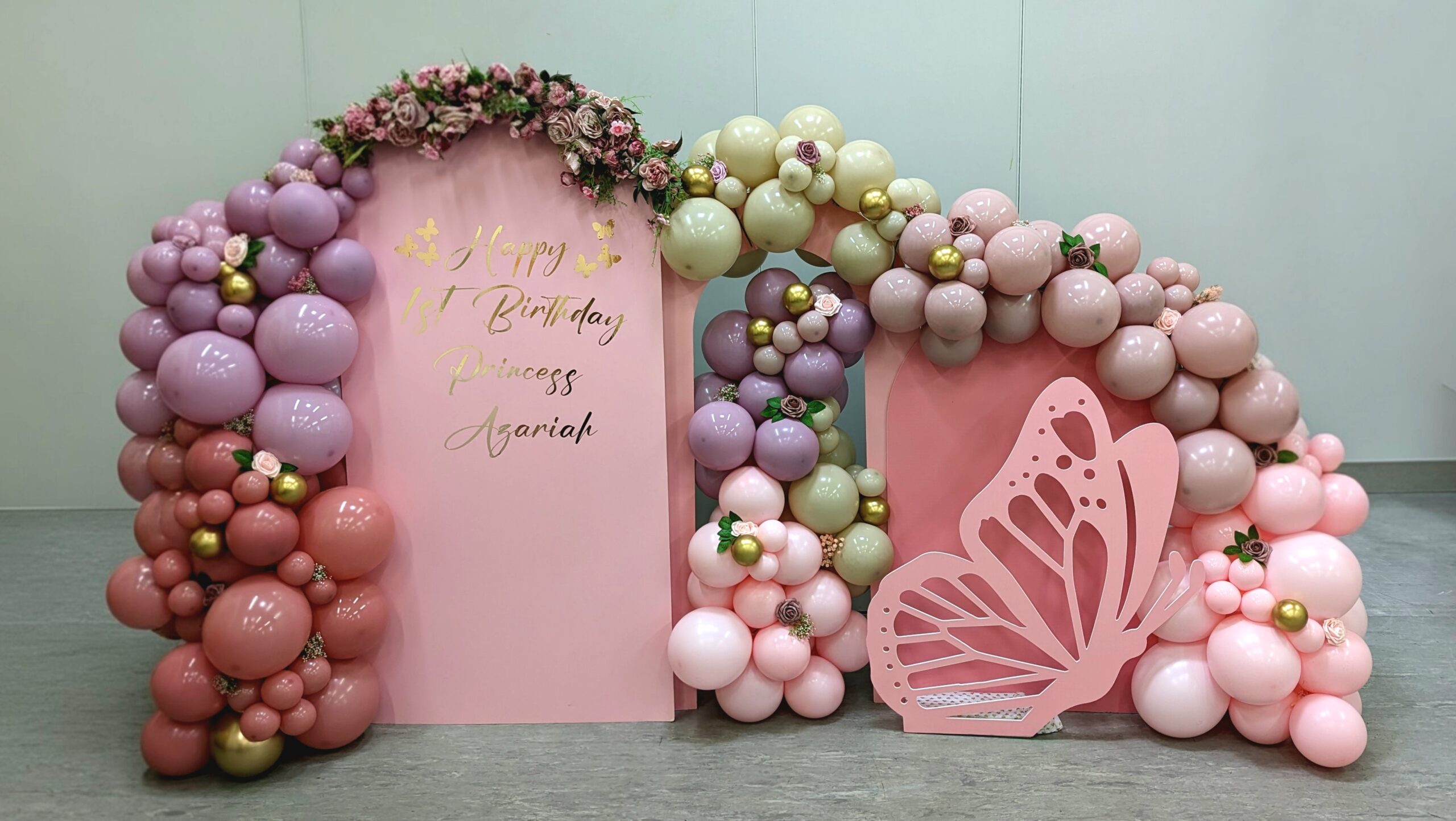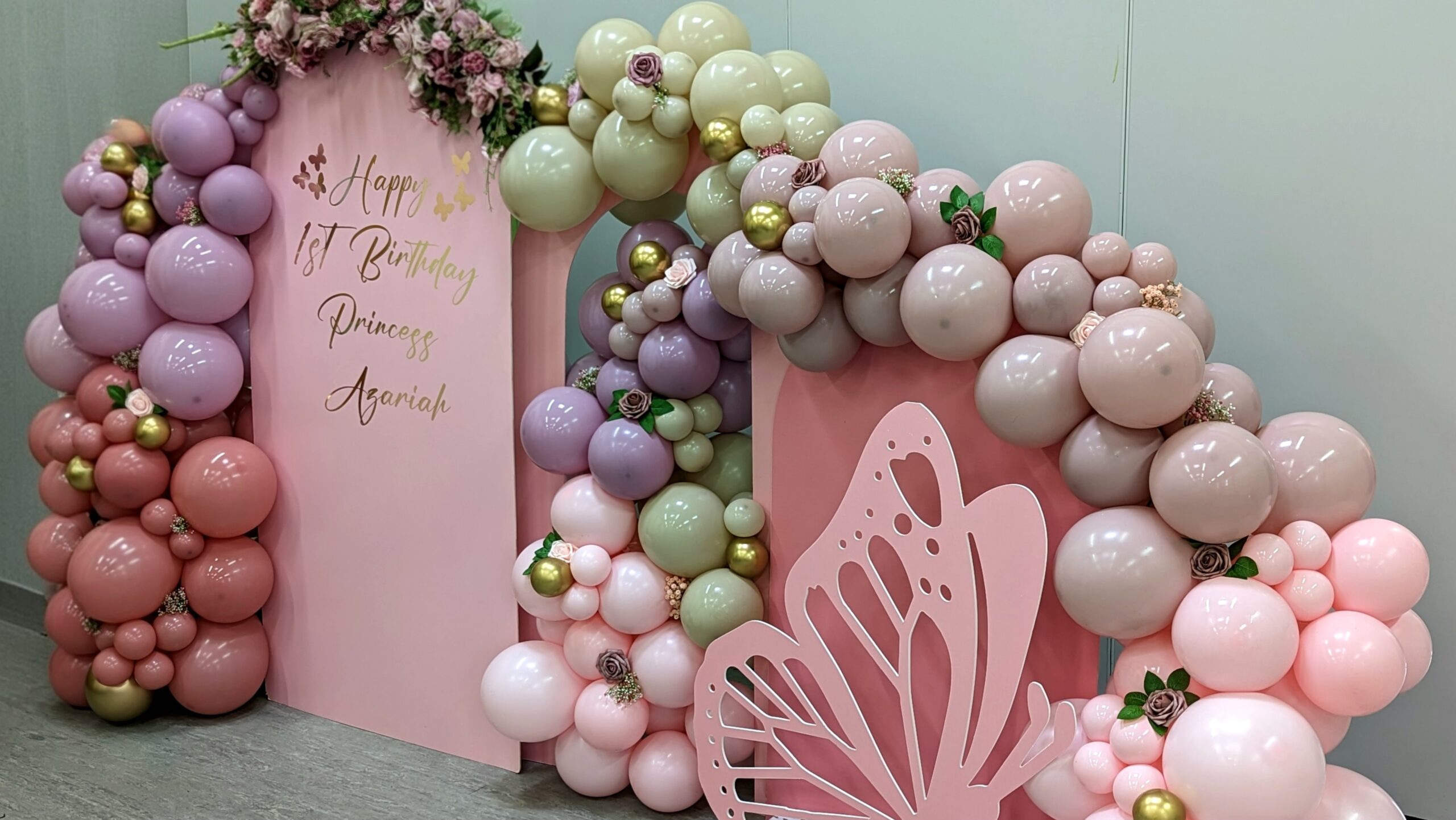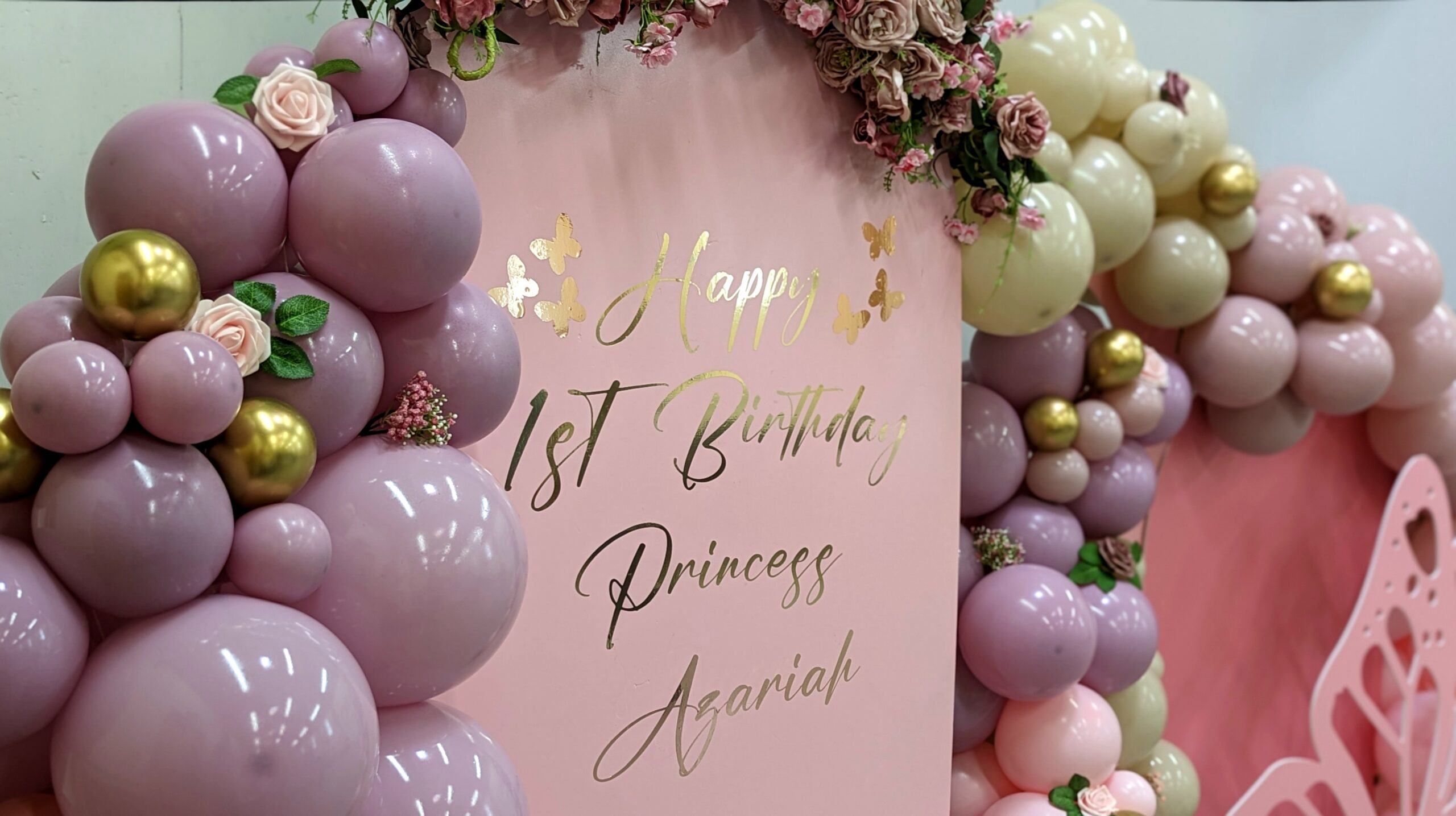 A stunning butterfly-themed celebration created for Princess Azariah’s 1st birthday in Croydon, South London. Styled in soft pastel pink, lilac and champagne tones, this elegant setup features a butterfly cut-out backdrop, delicate floral arrangements, and cascading balloon garlands accented with touches of gold.