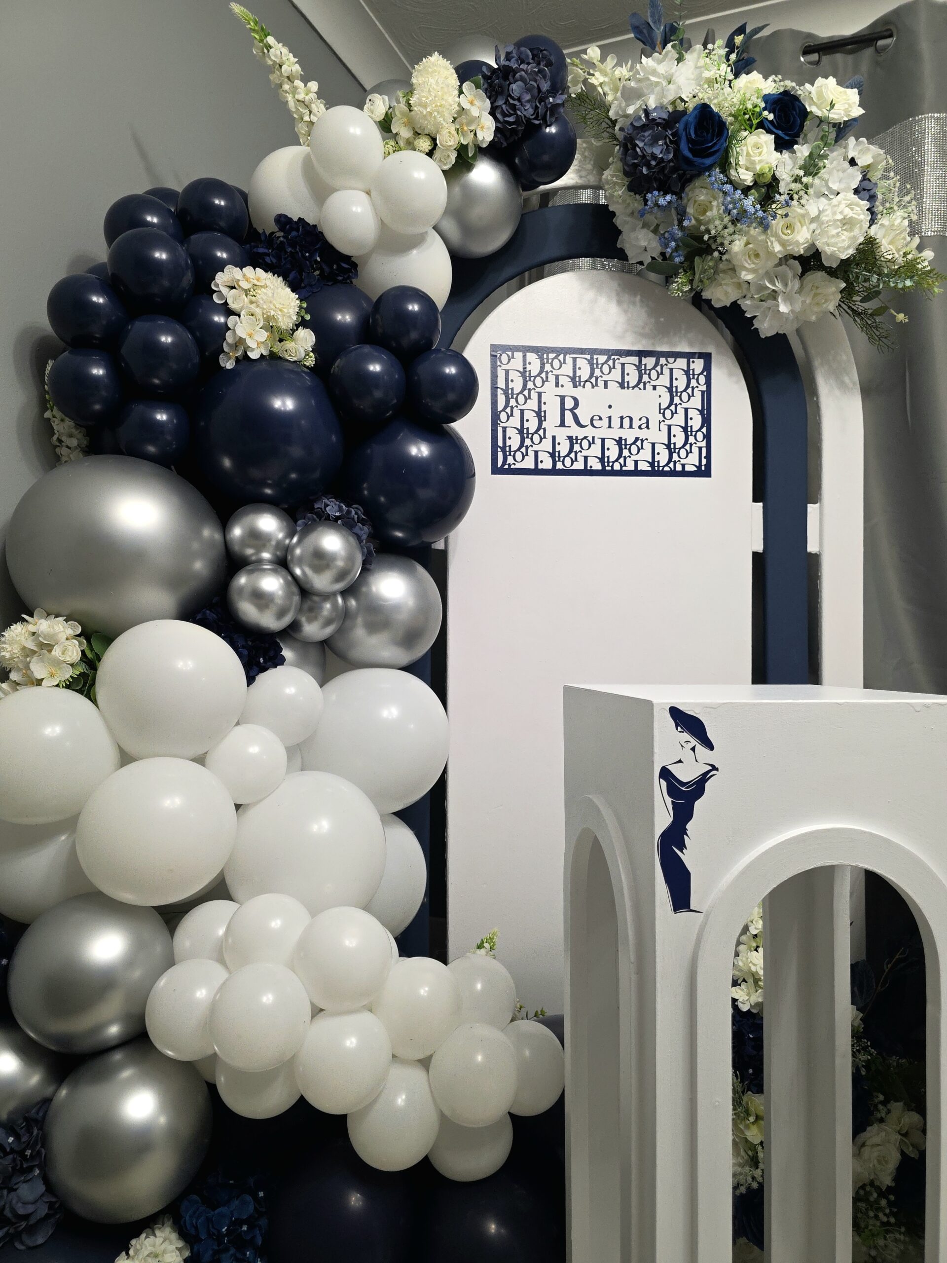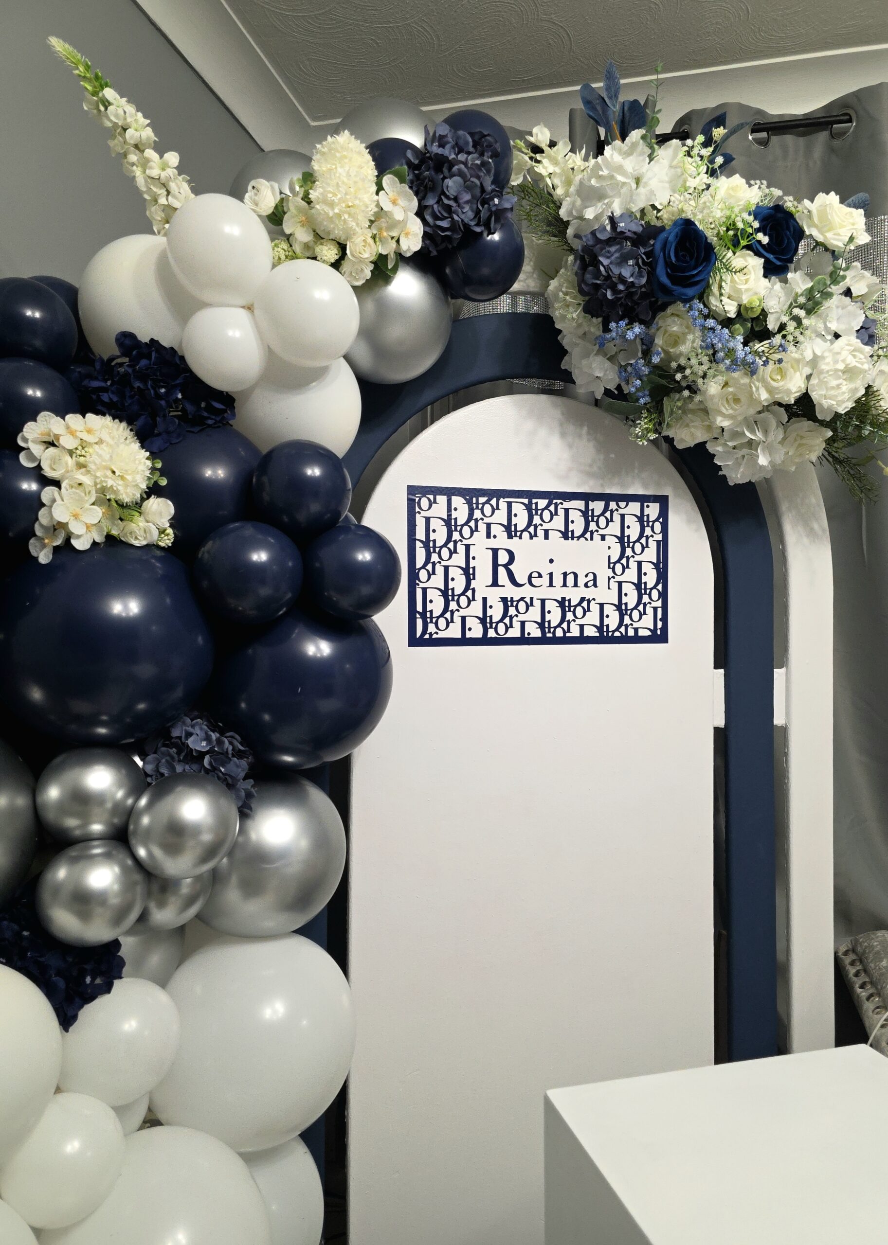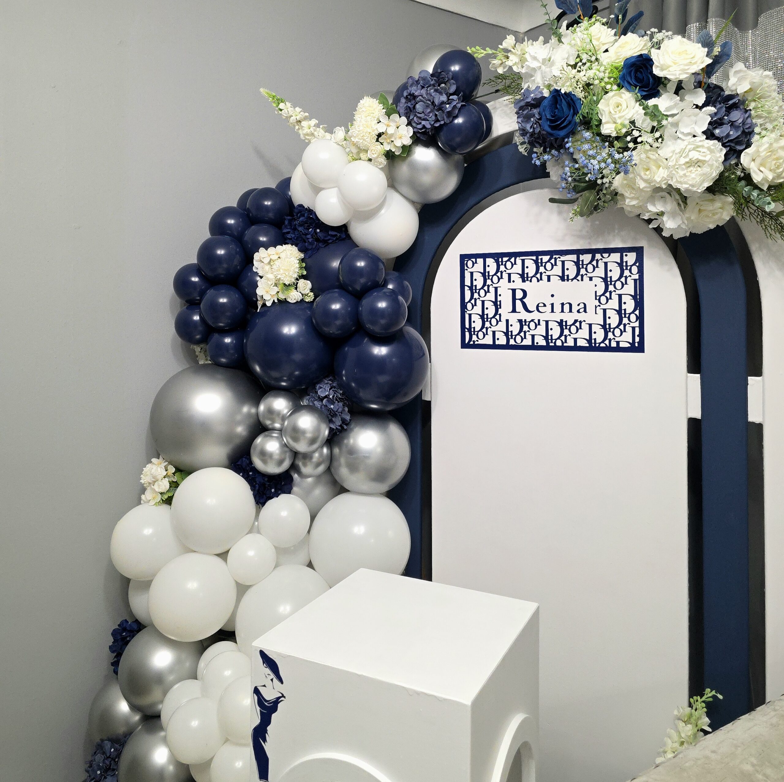 The balloon backdrop, complete with silver chrome accents and fresh florals, made a statement in the living area, styled around a branded Dior-patterned board with the celebrant’s name, Reina. In the dining area, we extended the theme with coordinated balloon garlands and statement florals, ensuring a seamless visual flow between spaces.
