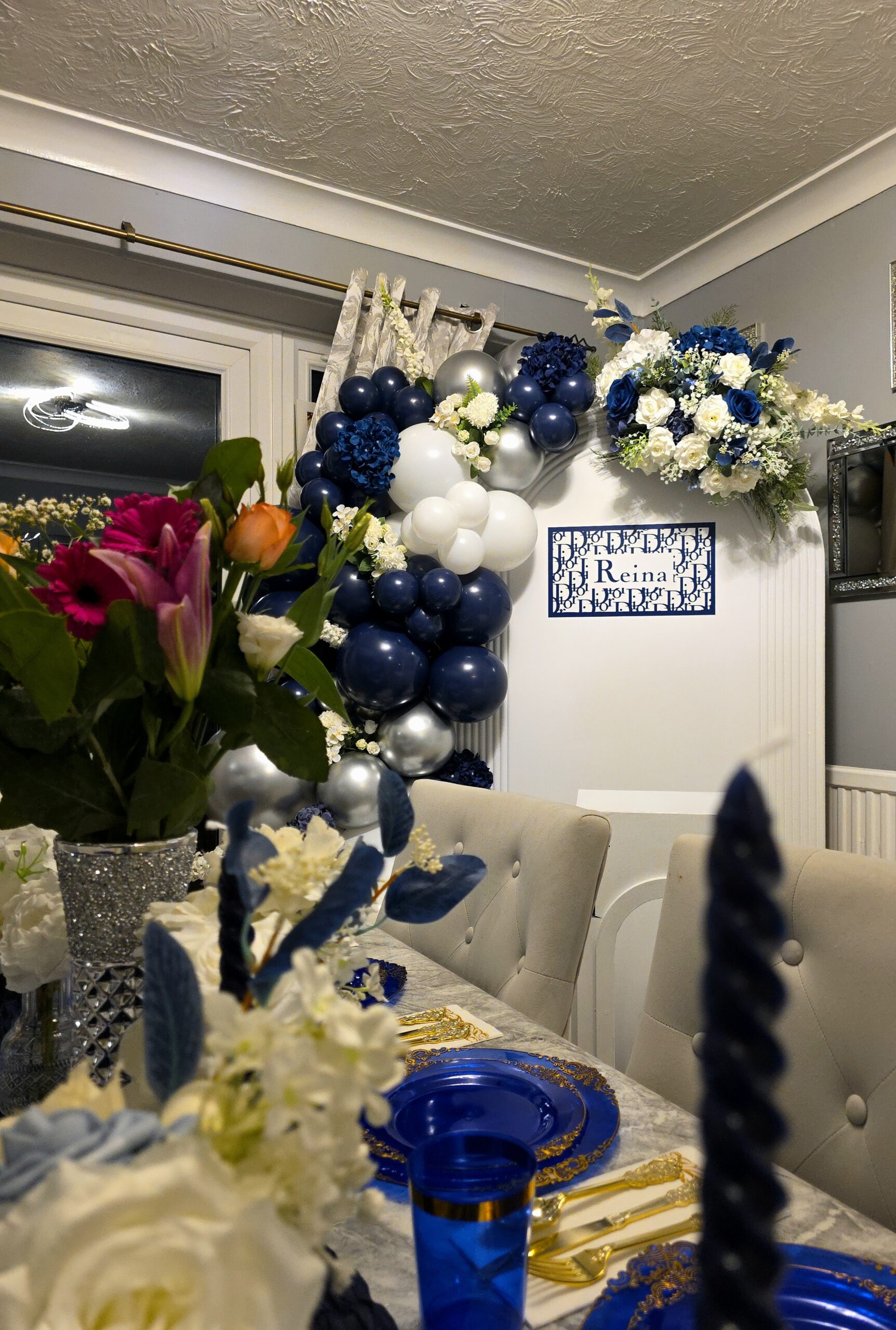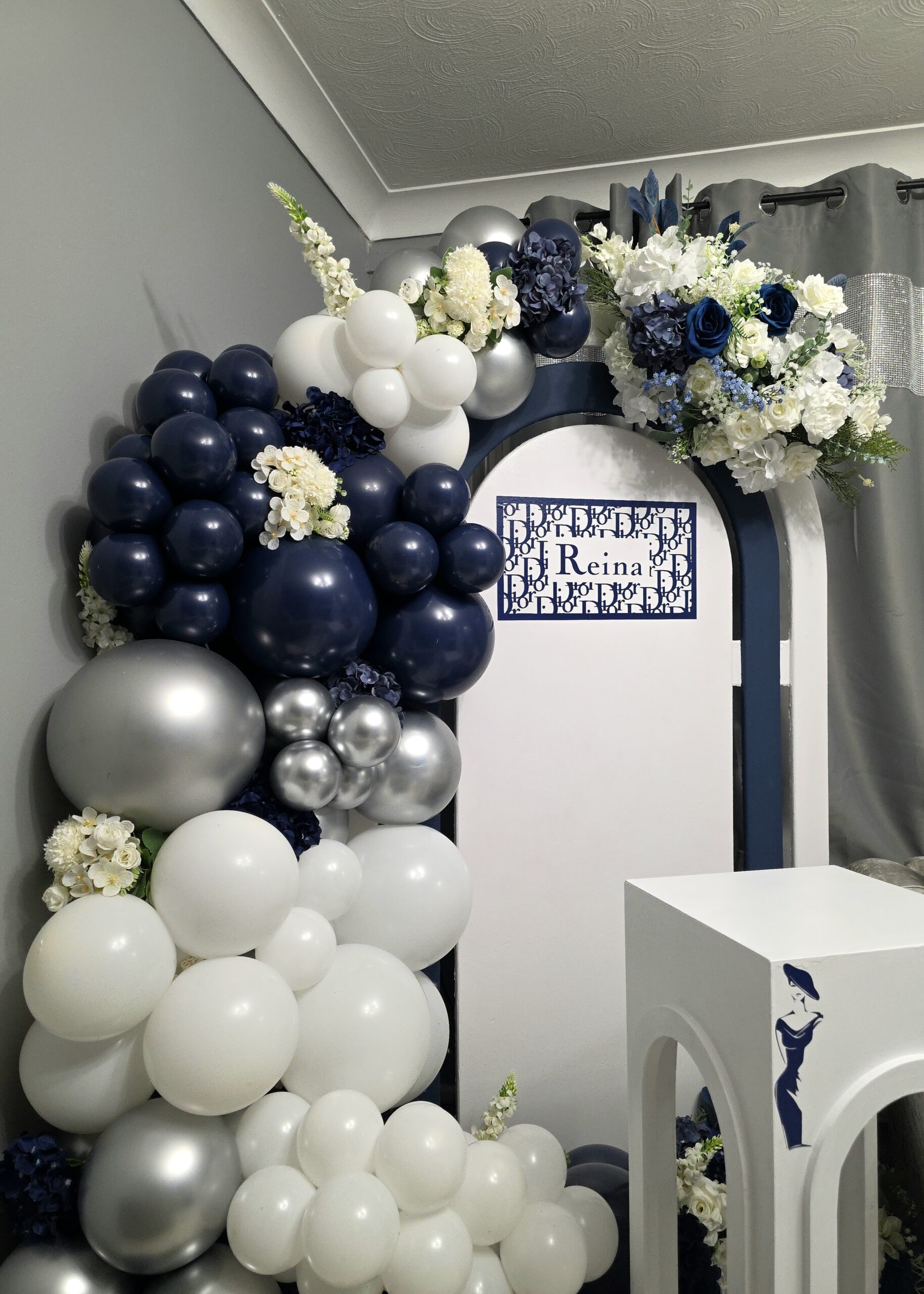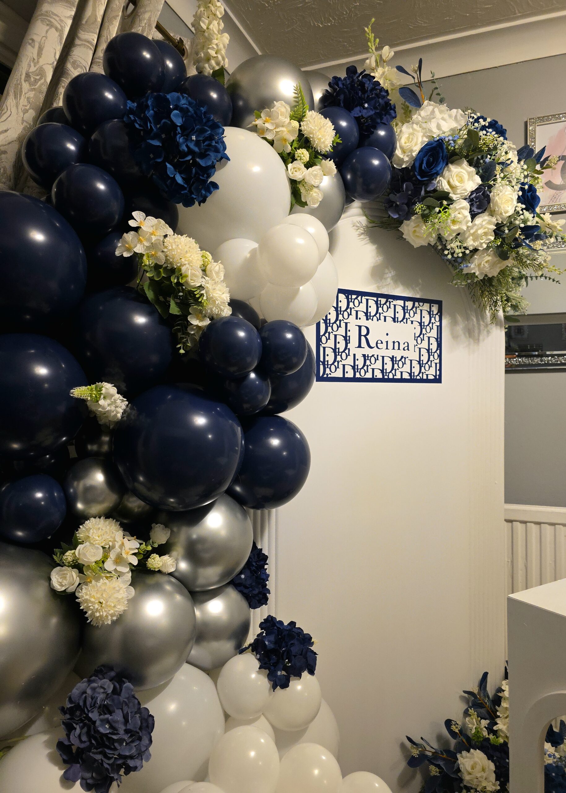 The balloon backdrop, complete with silver chrome accents and fresh florals, made a statement in the living area, styled around a branded Dior-patterned board with the celebrant’s name, Reina. In the dining area, we extended the theme with coordinated balloon garlands and statement florals, ensuring a seamless visual flow between spaces.