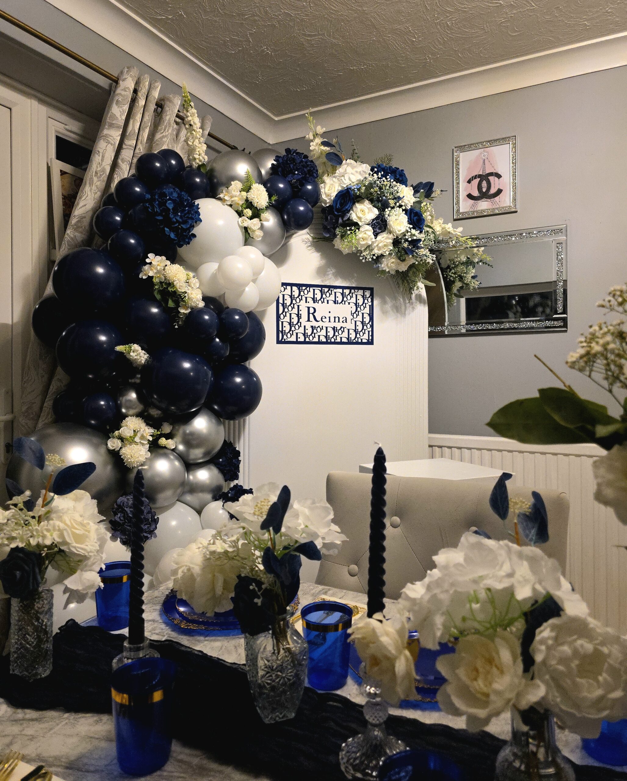 This Dior-inspired dinner party setup was a stunning blend of fashion, elegance and celebration, styled for a private home event. Designed across two spaces – the living room and the dining area – our decor featured a striking navy, white and silver palette, exuding luxury and sophistication.
