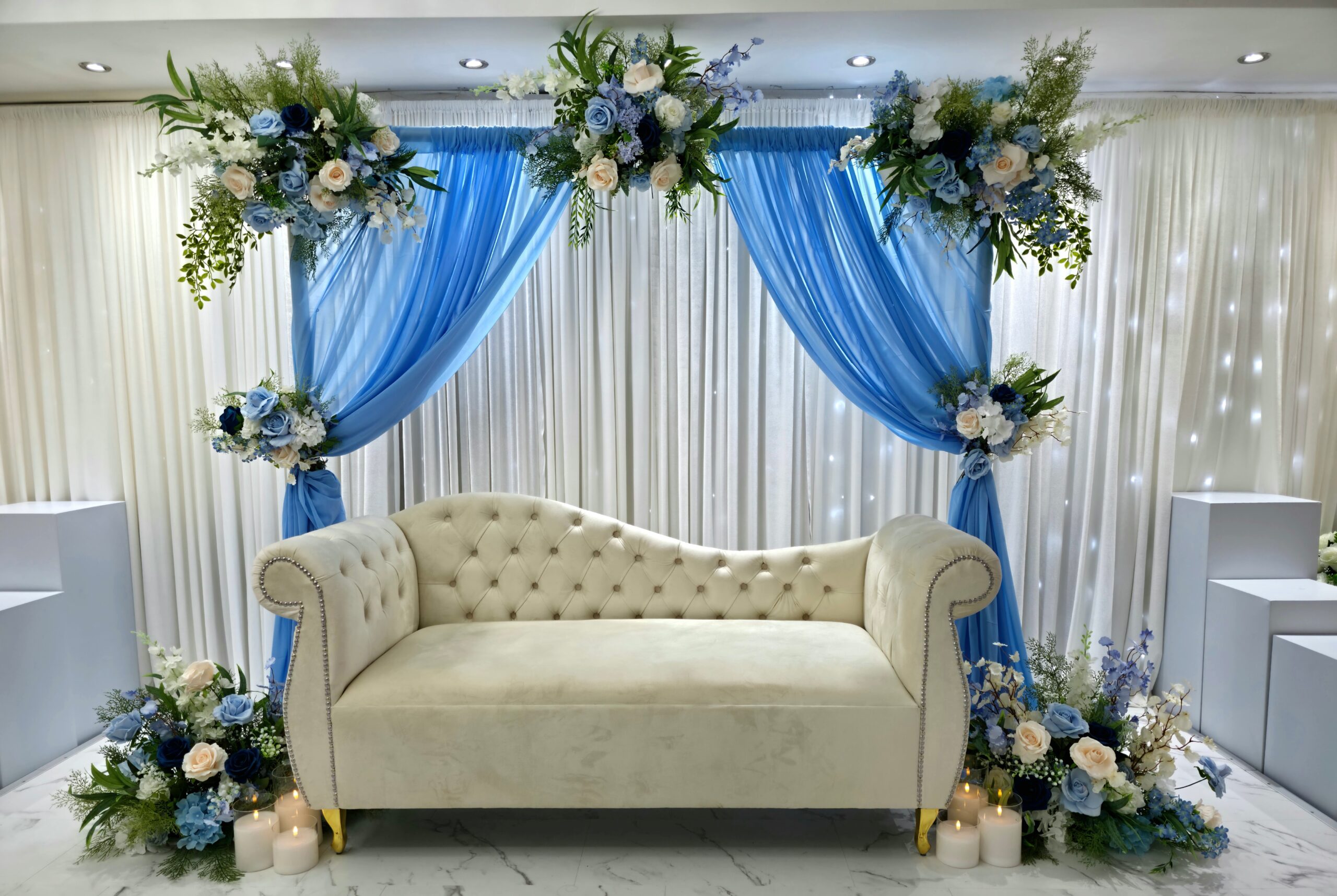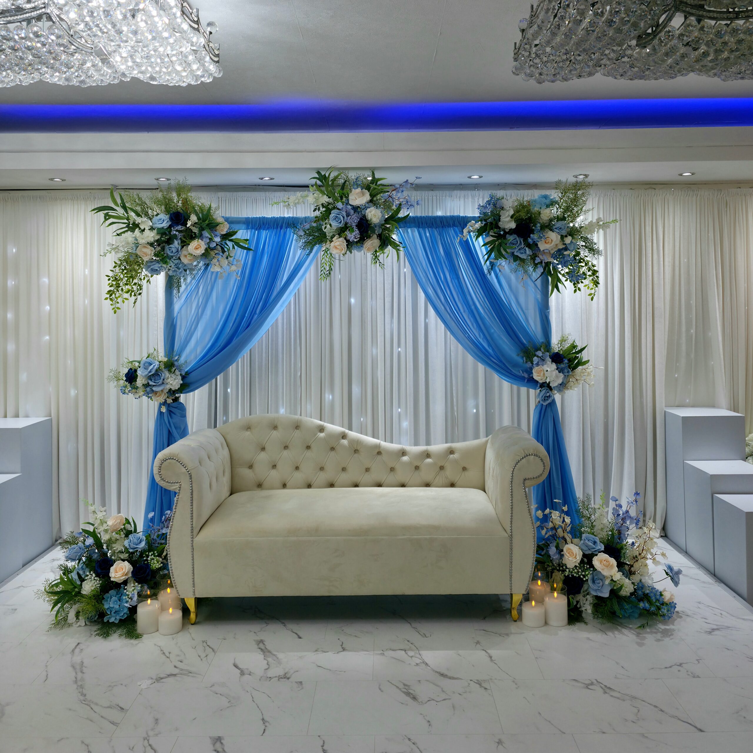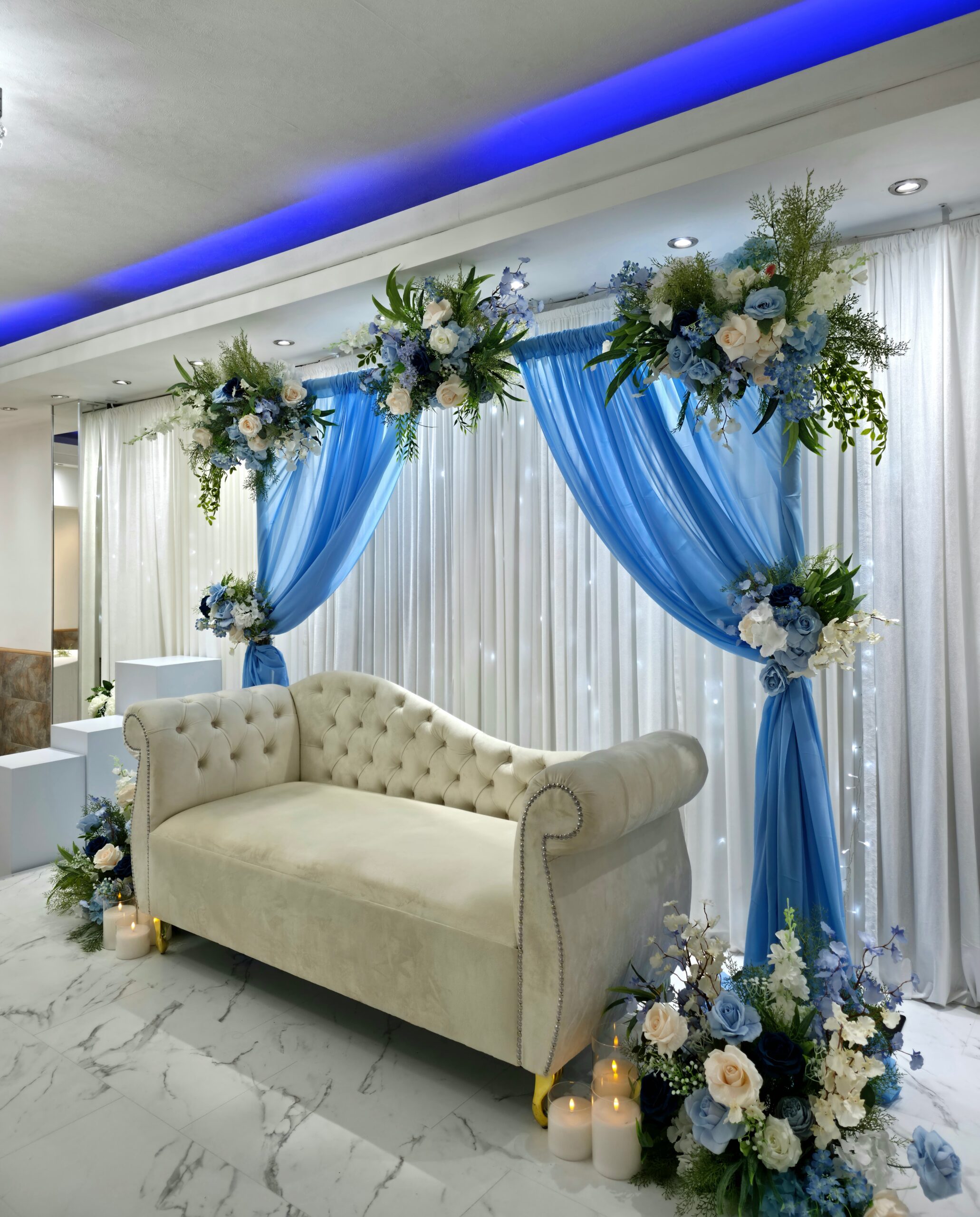 This breathtaking Nikkah setup at Safa Banqueting Hall in South Harrow exudes elegance, romance, and sophistication. The design centres around a luxurious cream velvet chaise sofa, perfectly framed by soft white draping with twinkling fairy lights, creating a dreamy backdrop. Flowing sheer blue fabric cascades gracefully across the stage, accented with lush floral arrangements in serene shades of blue, ivory, and green.