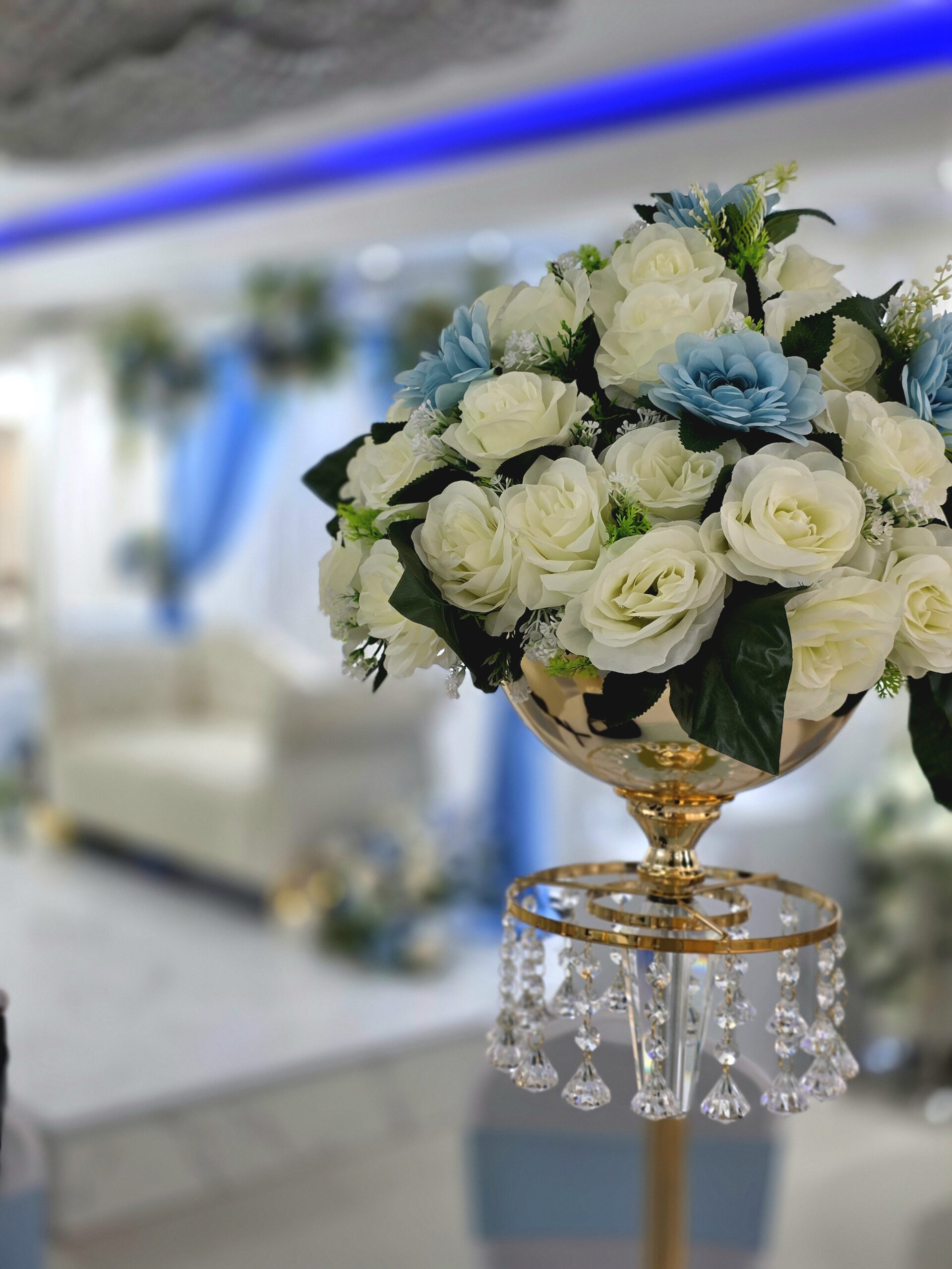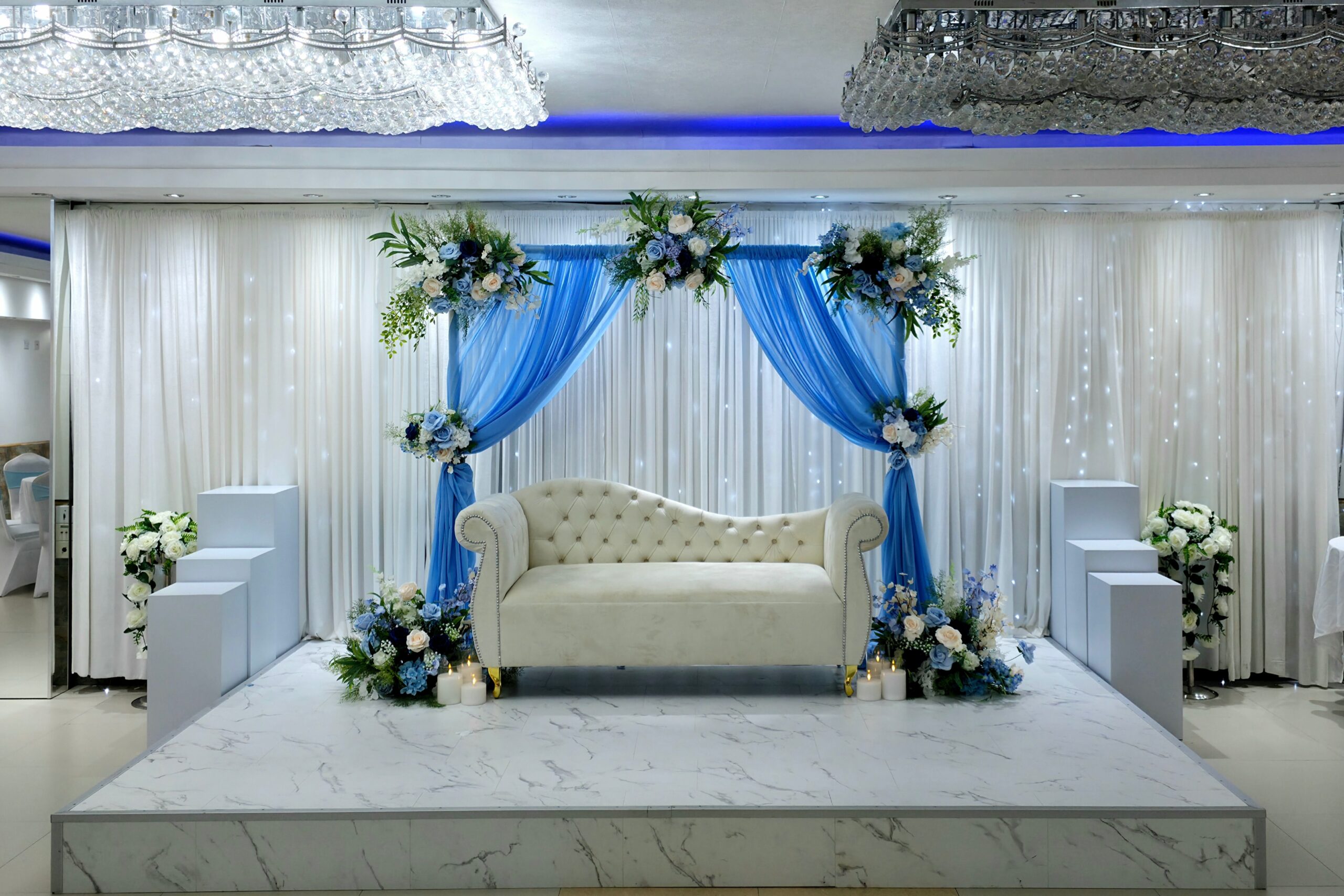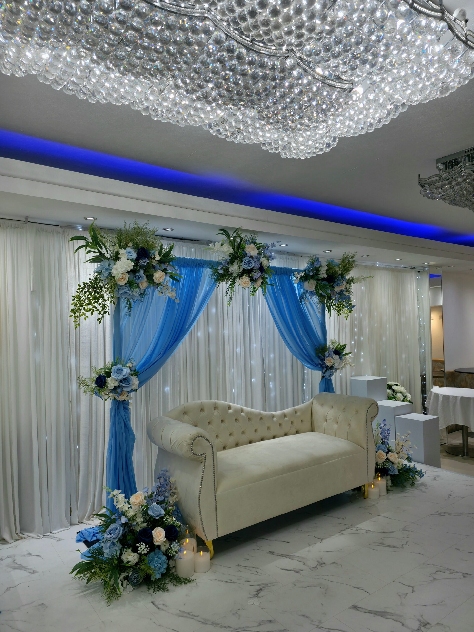 This breathtaking Nikkah setup at Safa Banqueting Hall in South Harrow exudes elegance, romance, and sophistication. The design centres around a luxurious cream velvet chaise sofa, perfectly framed by soft white draping with twinkling fairy lights, creating a dreamy backdrop. Flowing sheer blue fabric cascades gracefully across the stage, accented with lush floral arrangements in serene shades of blue, ivory, and green.