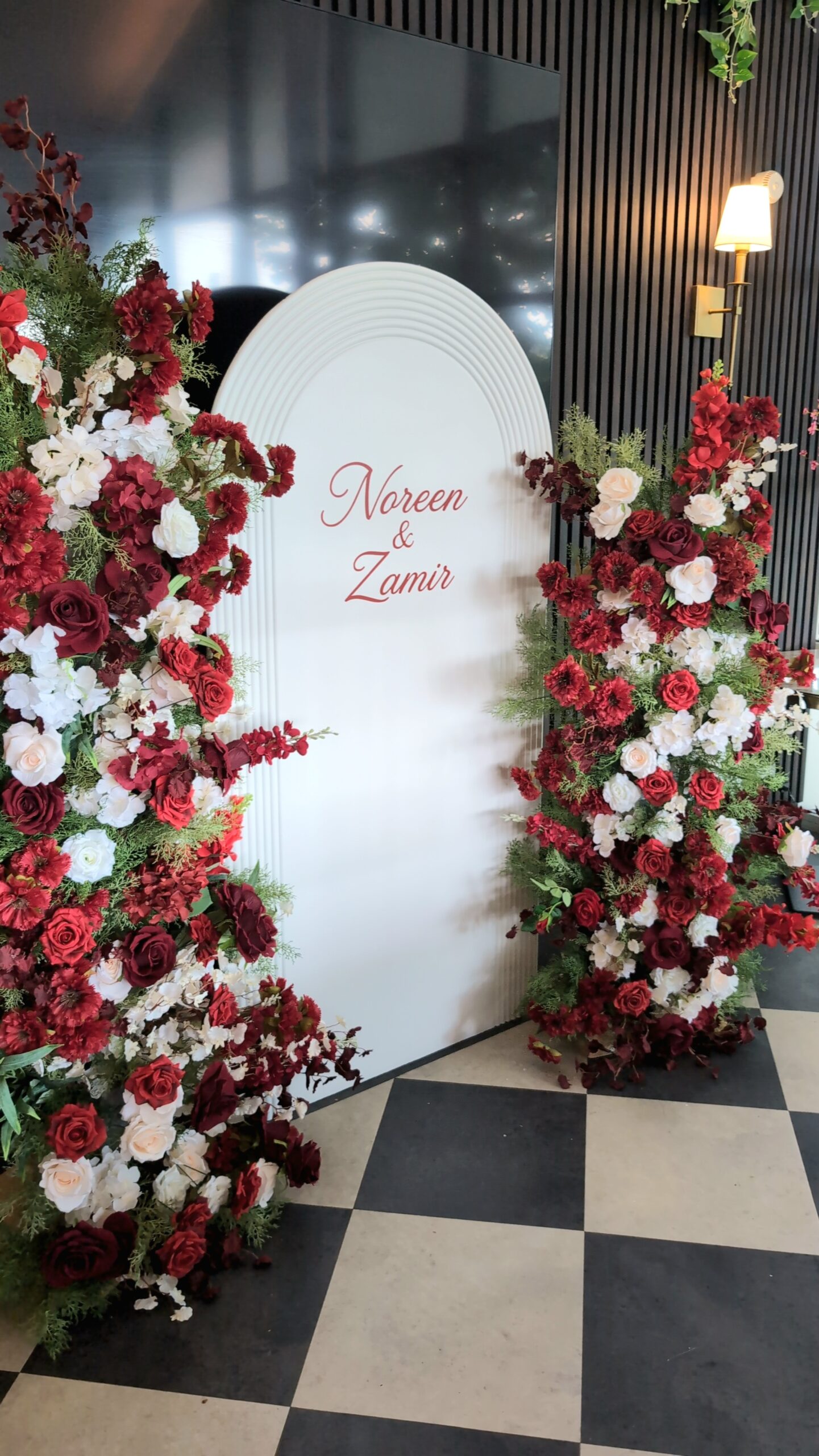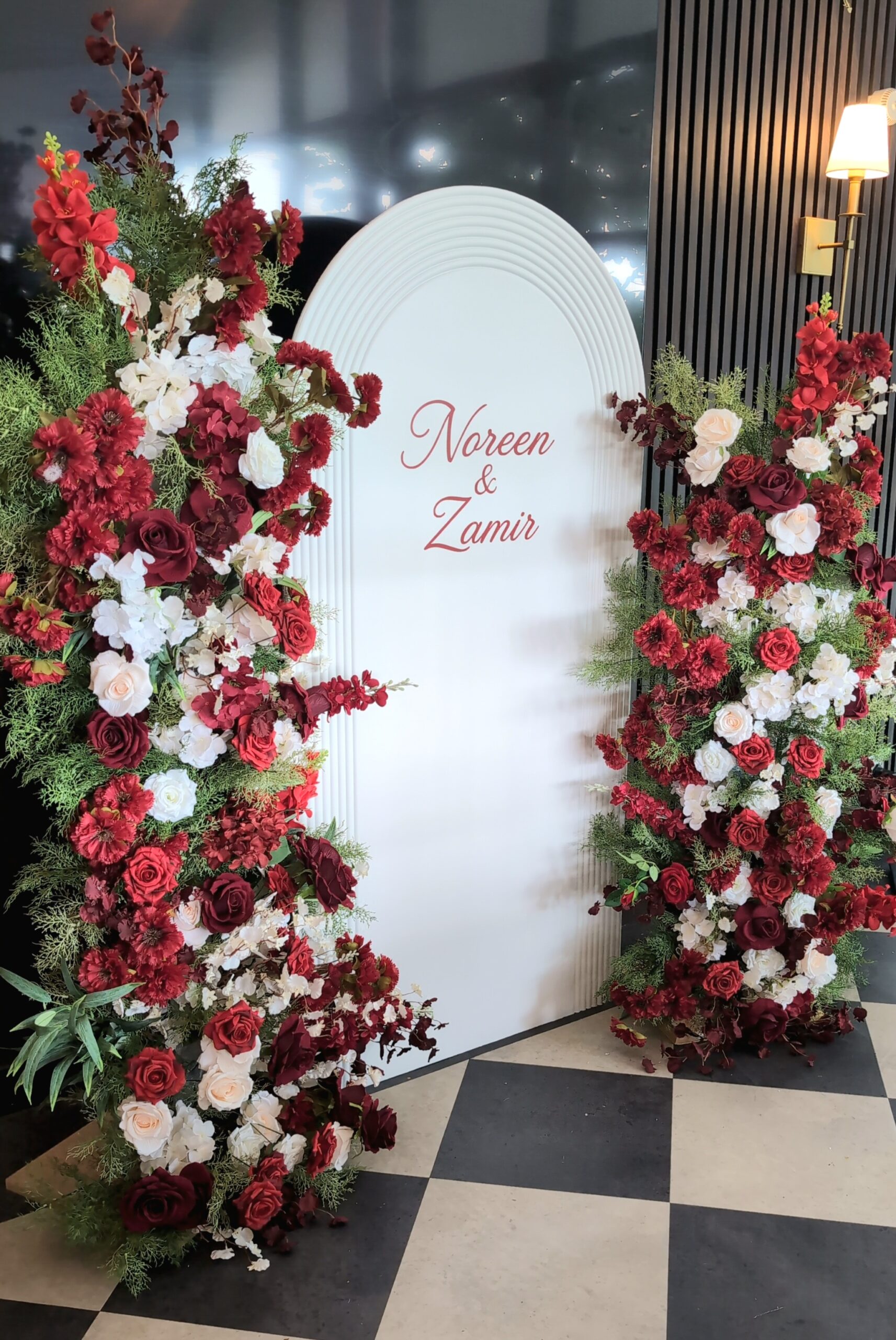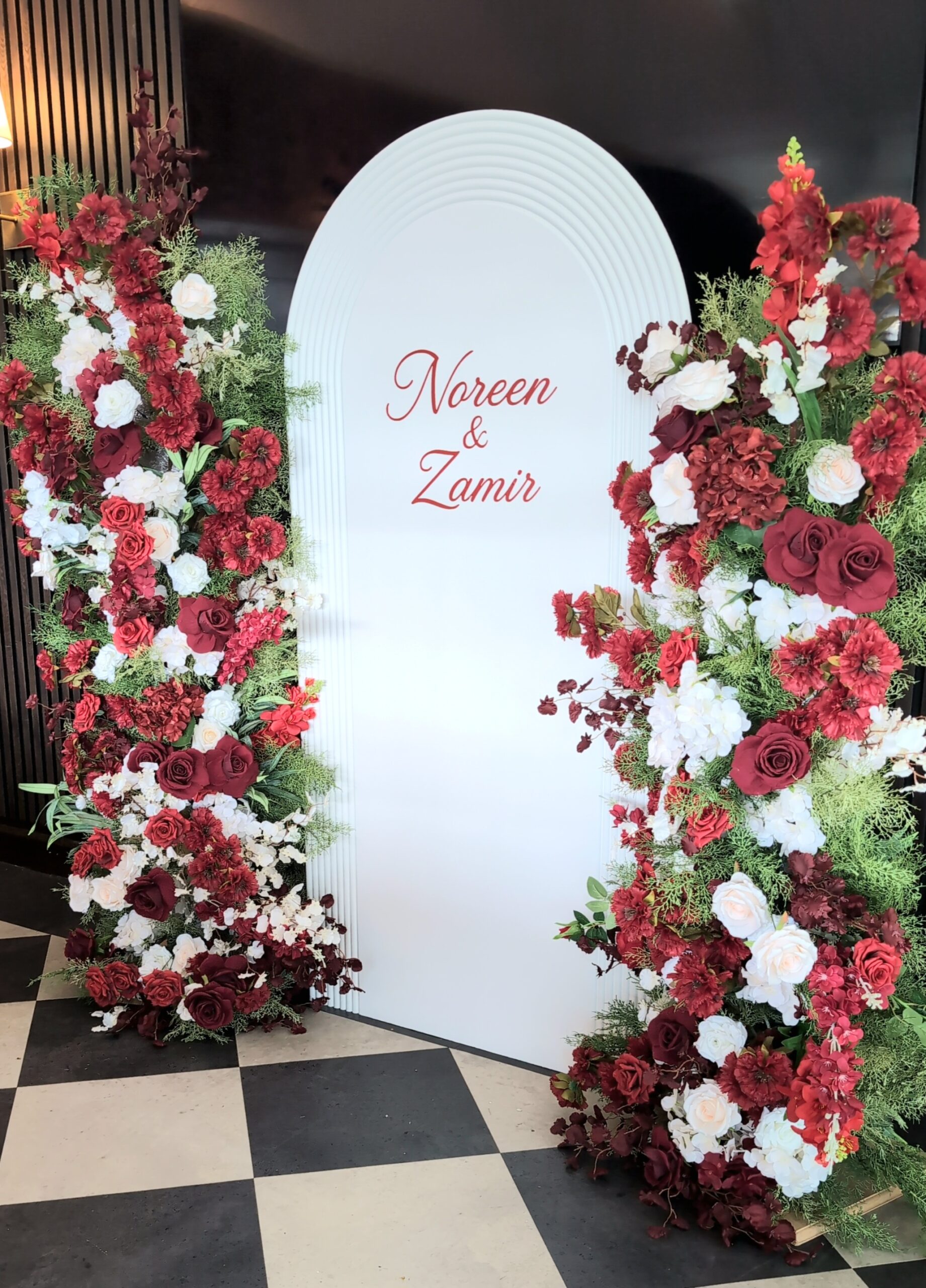 For this elegant Nikkah ceremony at the stunning The Orangery by Sapna, we designed a romantic and refined setup that perfectly complemented the venue’s luxurious ambience. The focal point was a tall, arched white backdrop personalised with the couple’s names, Noreen & Zamir, in a classic script font. This was framed by lush, asymmetrical floral arrangements cascading down each side, combining deep burgundy, rich red, blush pink, and crisp white blooms with fresh green foliage for texture and depth.