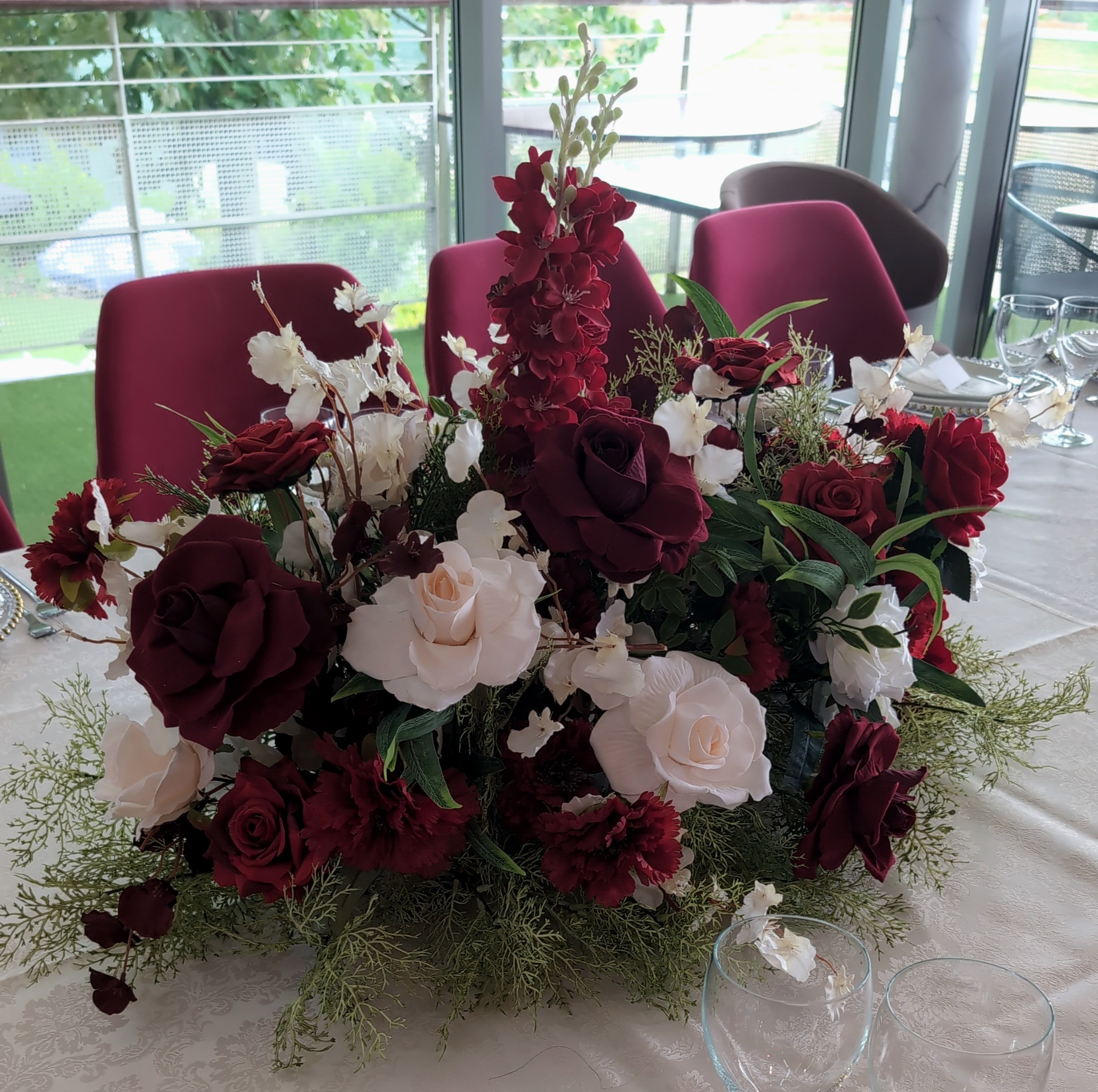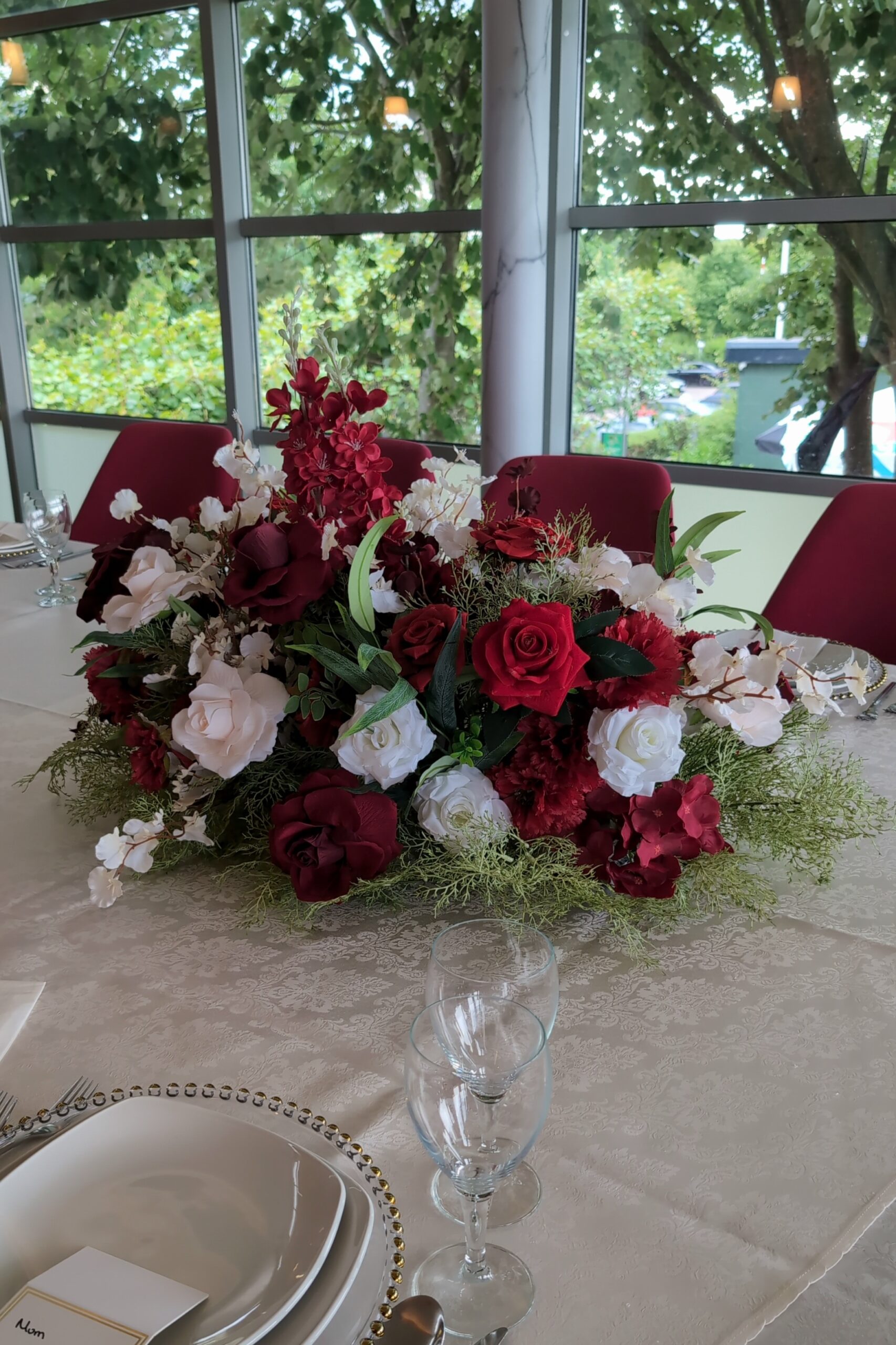 To complete the look, we styled coordinating table centrepieces featuring a harmonious blend of roses, carnations, and delicate filler florals. These arrangements sat in elegant low designs, allowing guests to converse easily while still making a statement on the tables dressed in ivory linens. The combination of bold red tones and soft blush accents created a sophisticated yet warm atmosphere, perfectly in keeping with the joyous celebration.