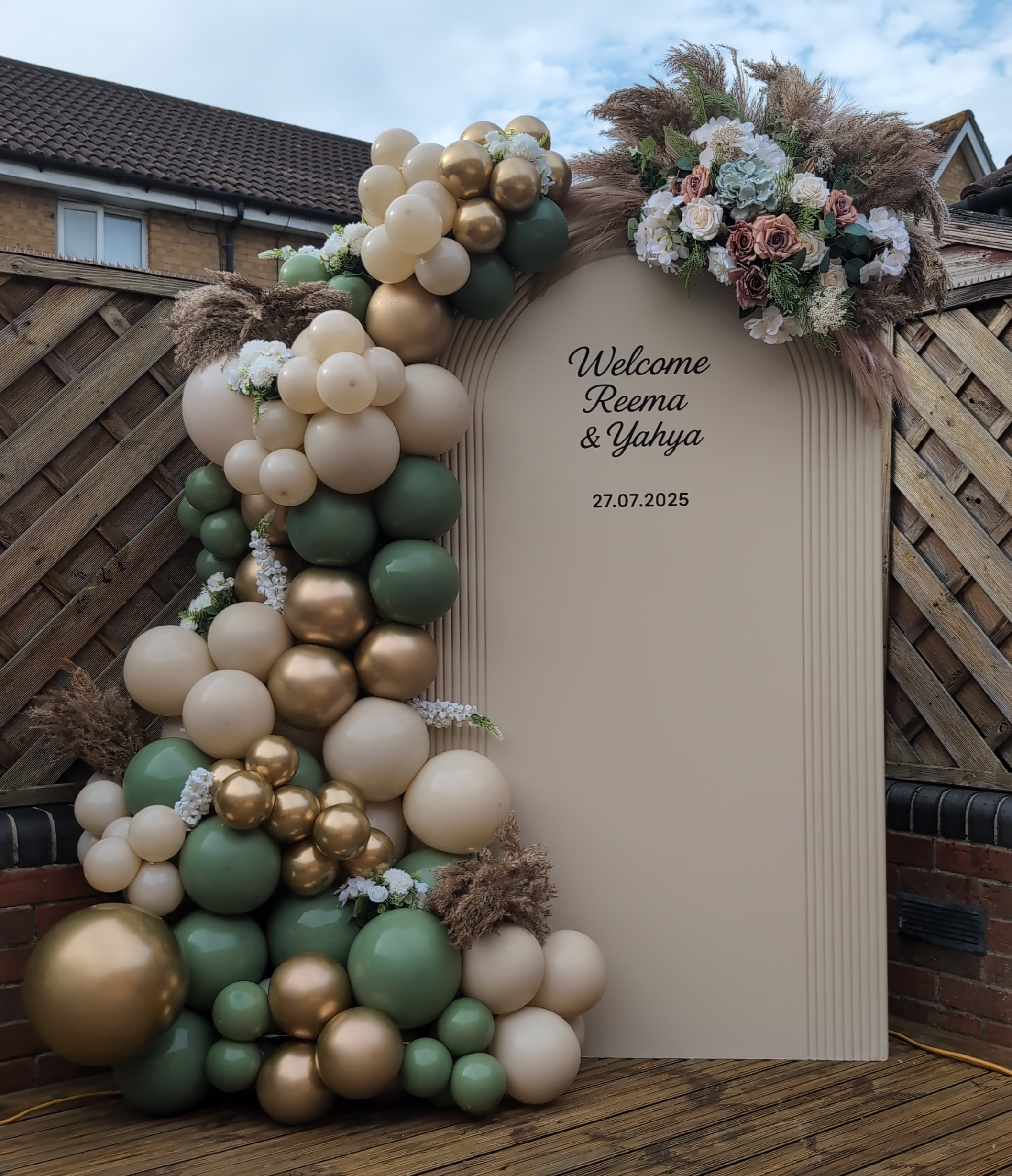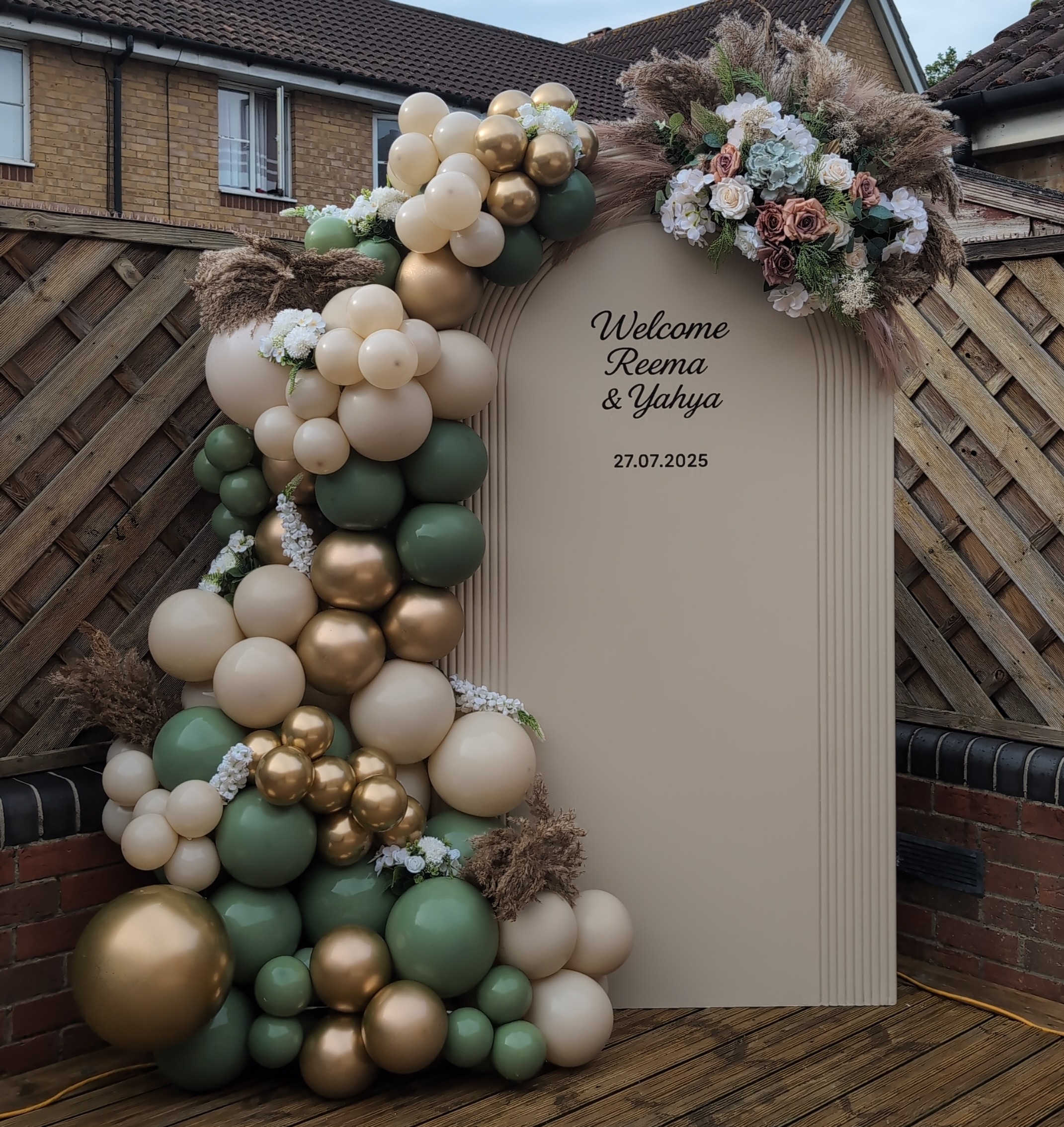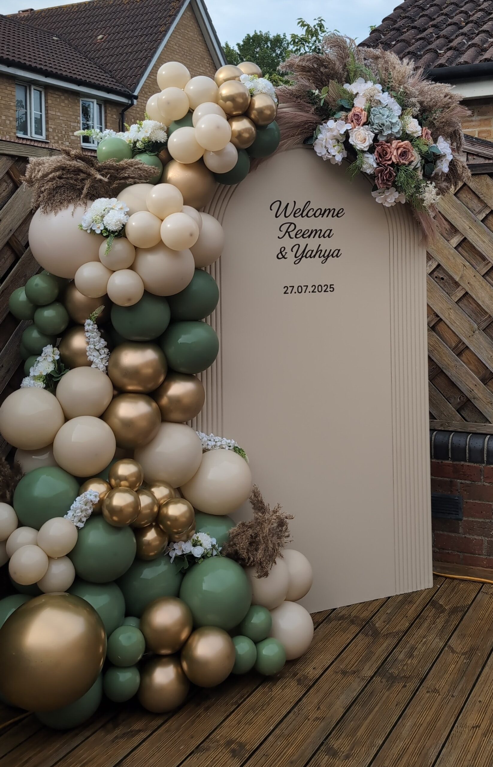This elegant Nikkah setup in East London was styled in a luxurious blend of cream, sage green, and metallic gold tones, paired with pampas grass and realistic silk florals for a romantic and refined look. The design featured a tall, arched beige backdrop with personalised vinyl text welcoming Reema & Yahya, alongside the date of their special day, 27.07.2025.