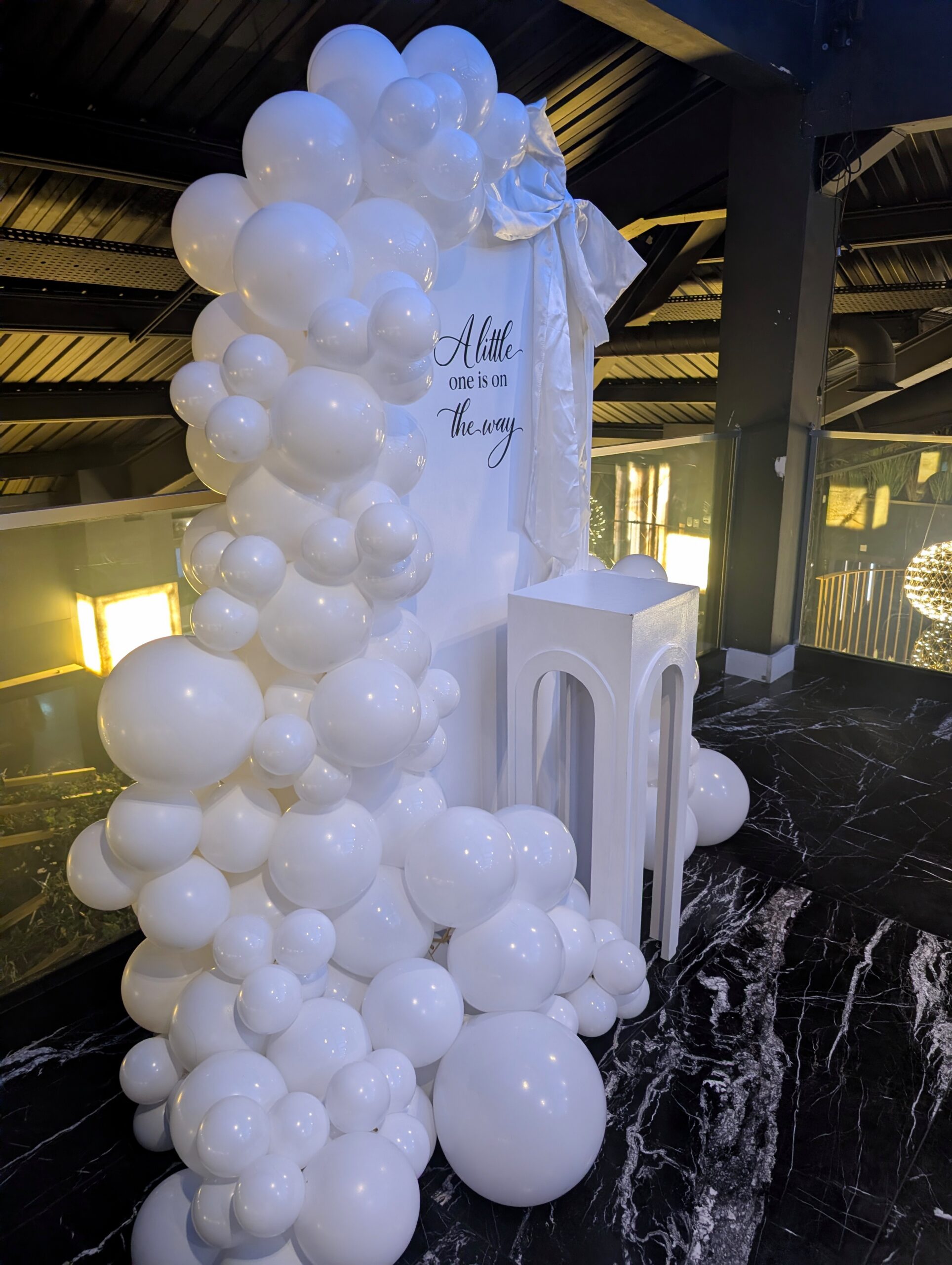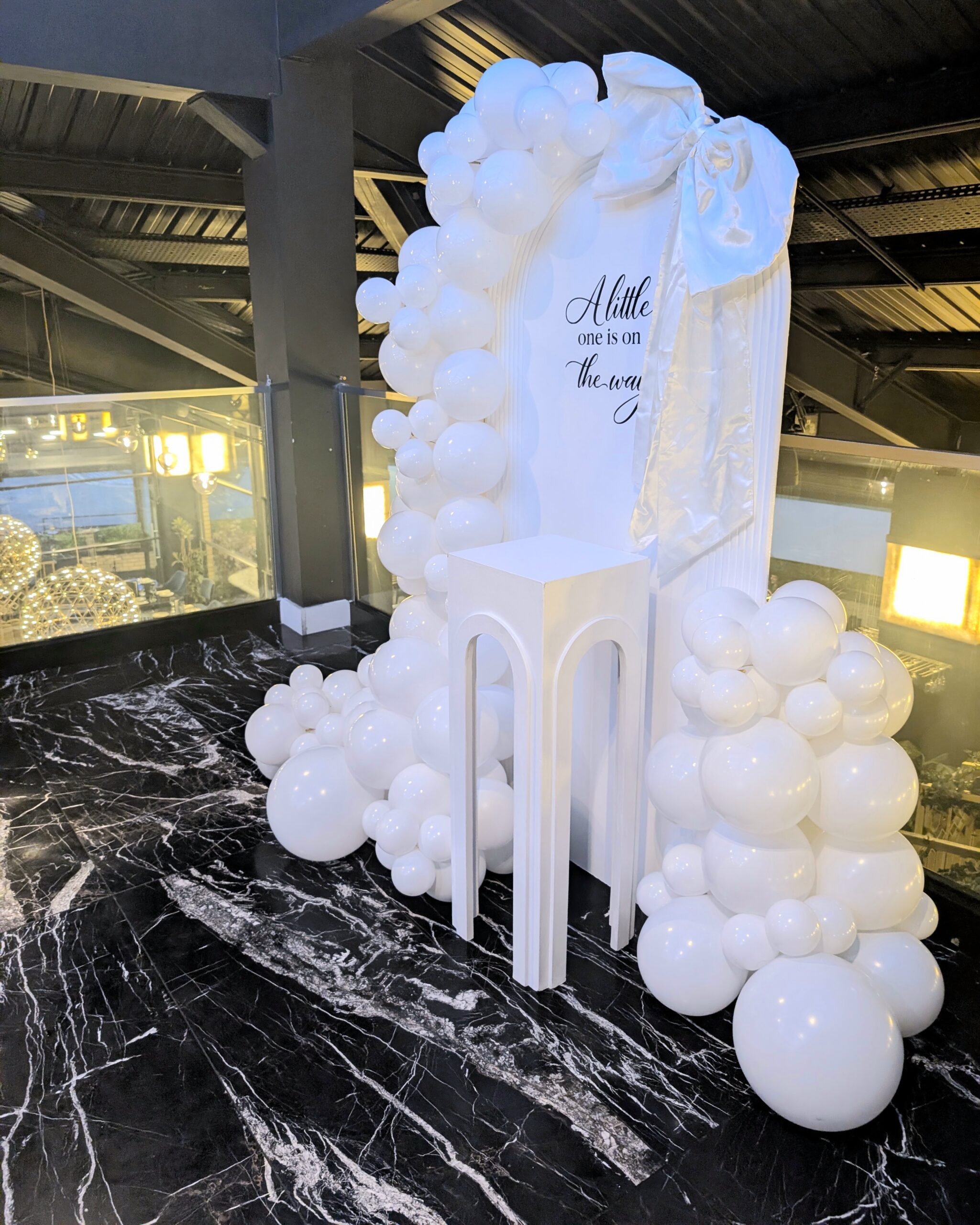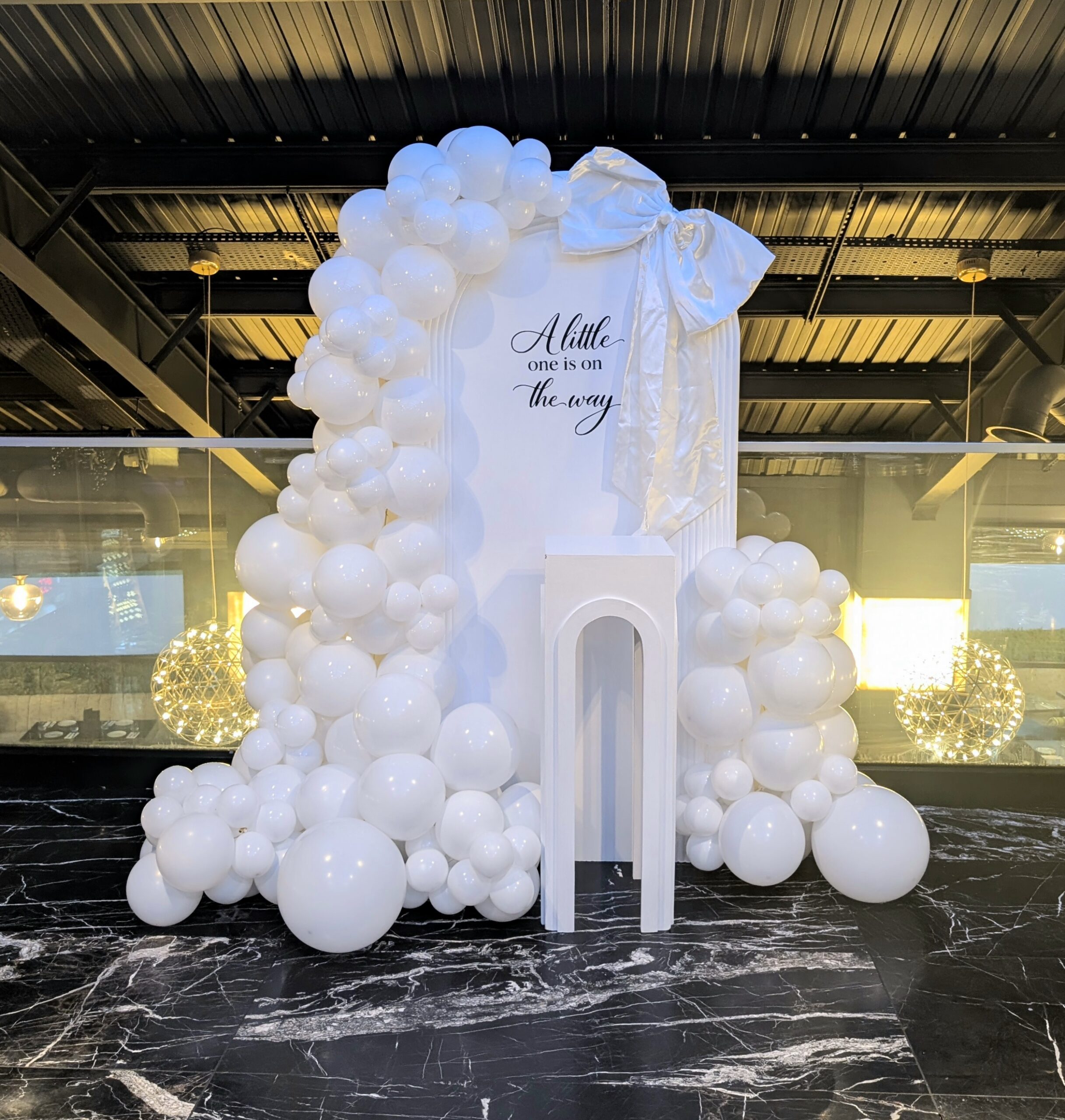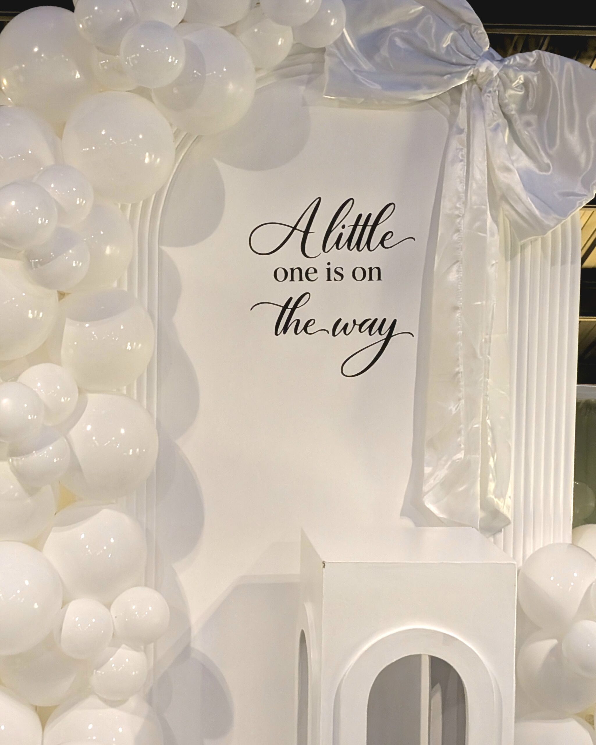 The focal point of the setup was a bespoke arched backdrop featuring the soft script message “A little one is on the way”, styled to feel calm, refined and effortlessly beautiful. The backdrop was framed with a full white balloon installation, using a mix of balloon sizes to add depth and texture while keeping the colour palette soft and neutral.