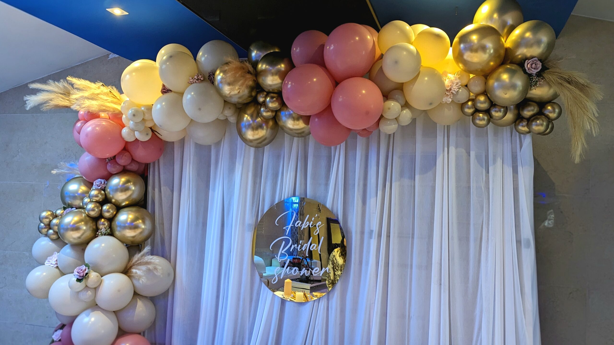 A romantic bridal shower setup styled for Fabi at Chigwell Pool House, combining elegant tones of champagne, blush pink, ivory and gold. The draped white backdrop was beautifully framed with cascading balloon garlands accented by gold orbs, pampas grass and roses, creating a soft and luxurious look.