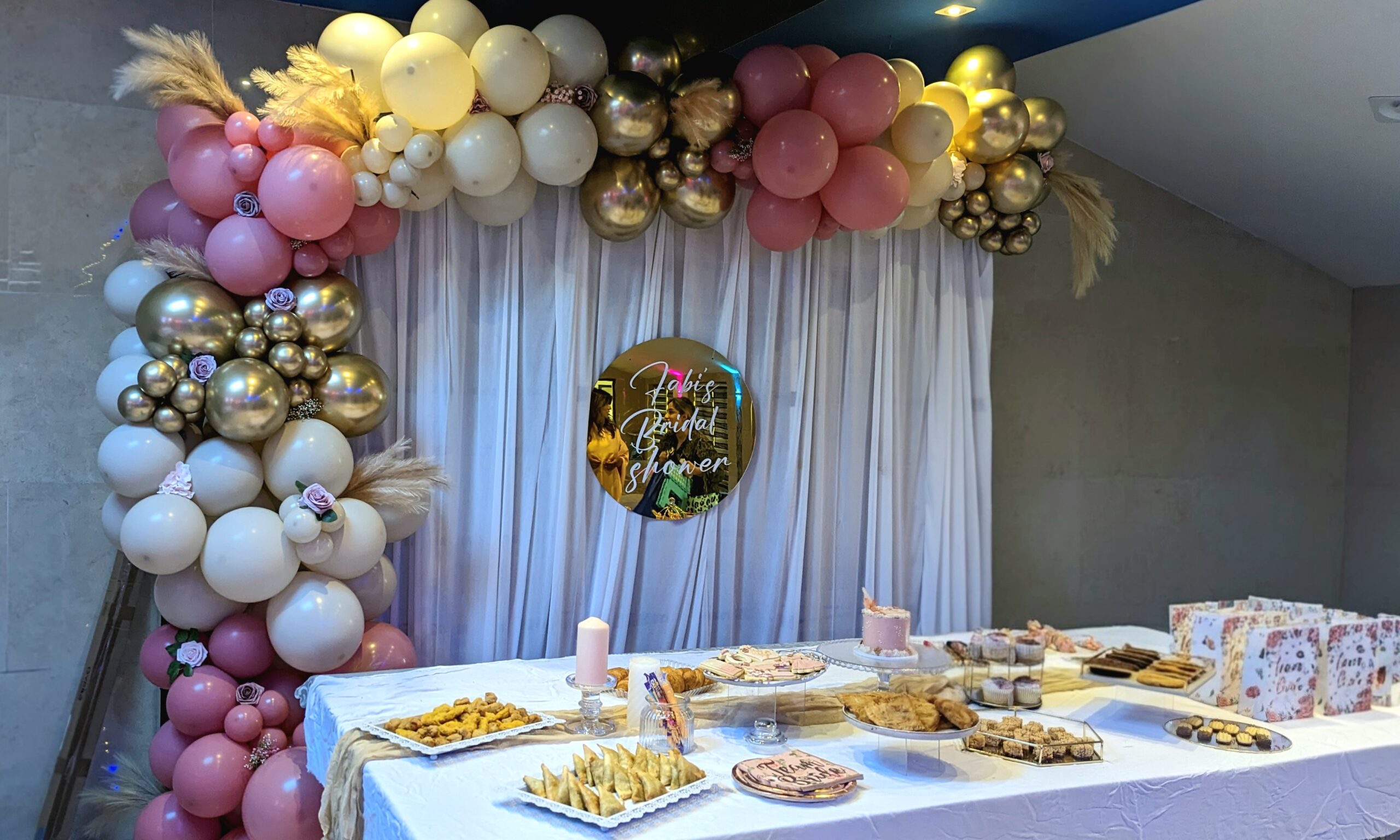A personalised gold mirror sign added a bespoke touch, while the matching dessert table perfectly complemented the setup — ideal for celebrating the bride-to-be in style.