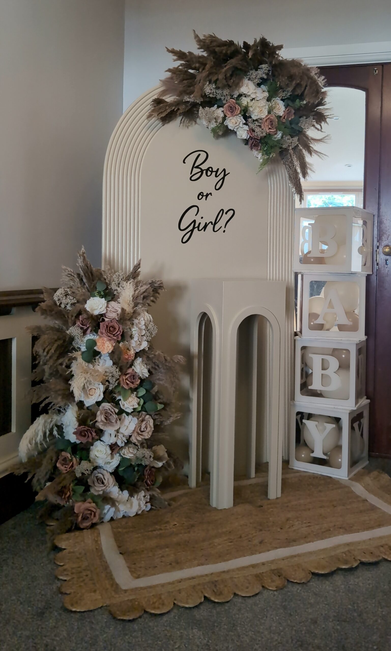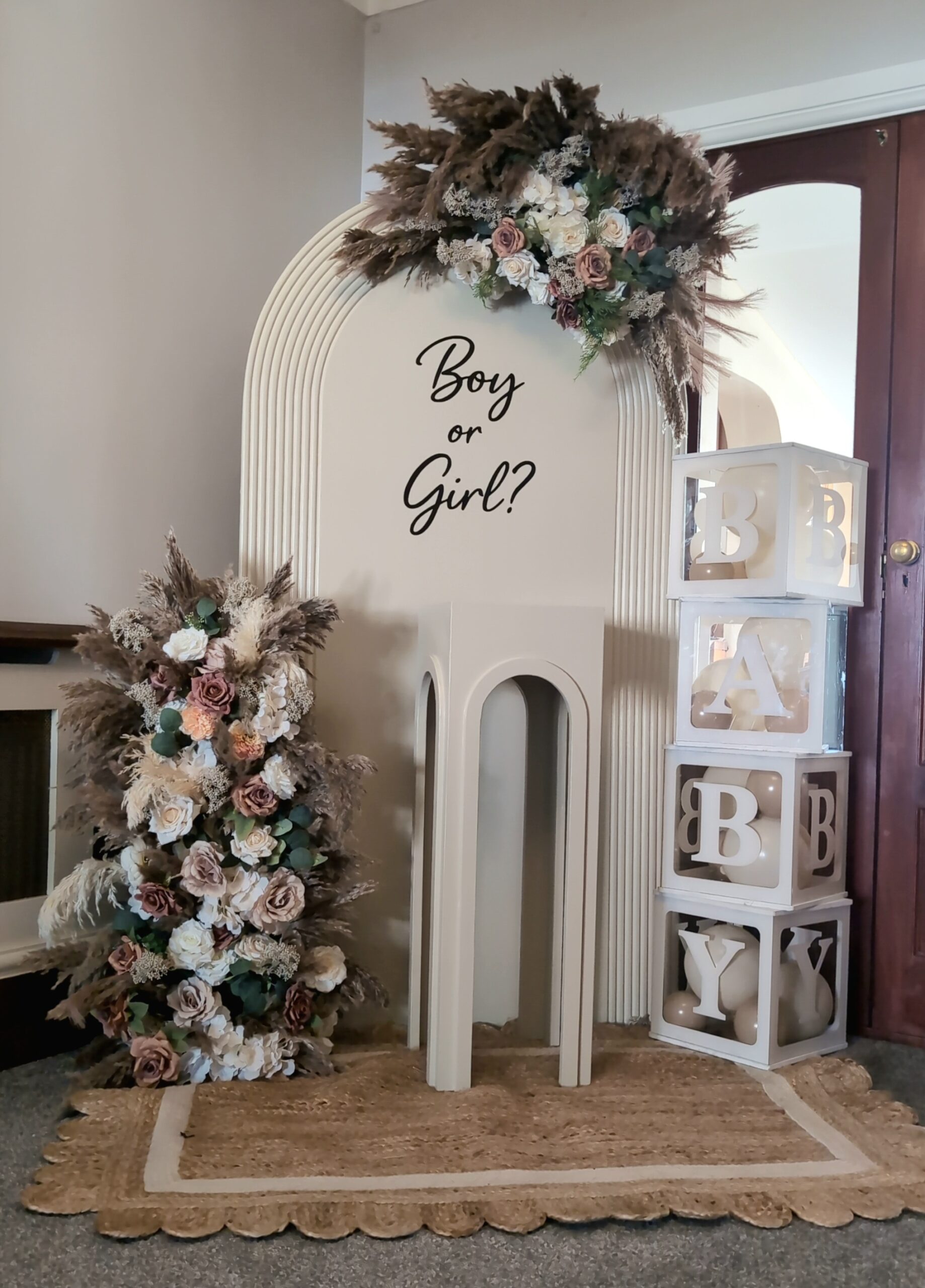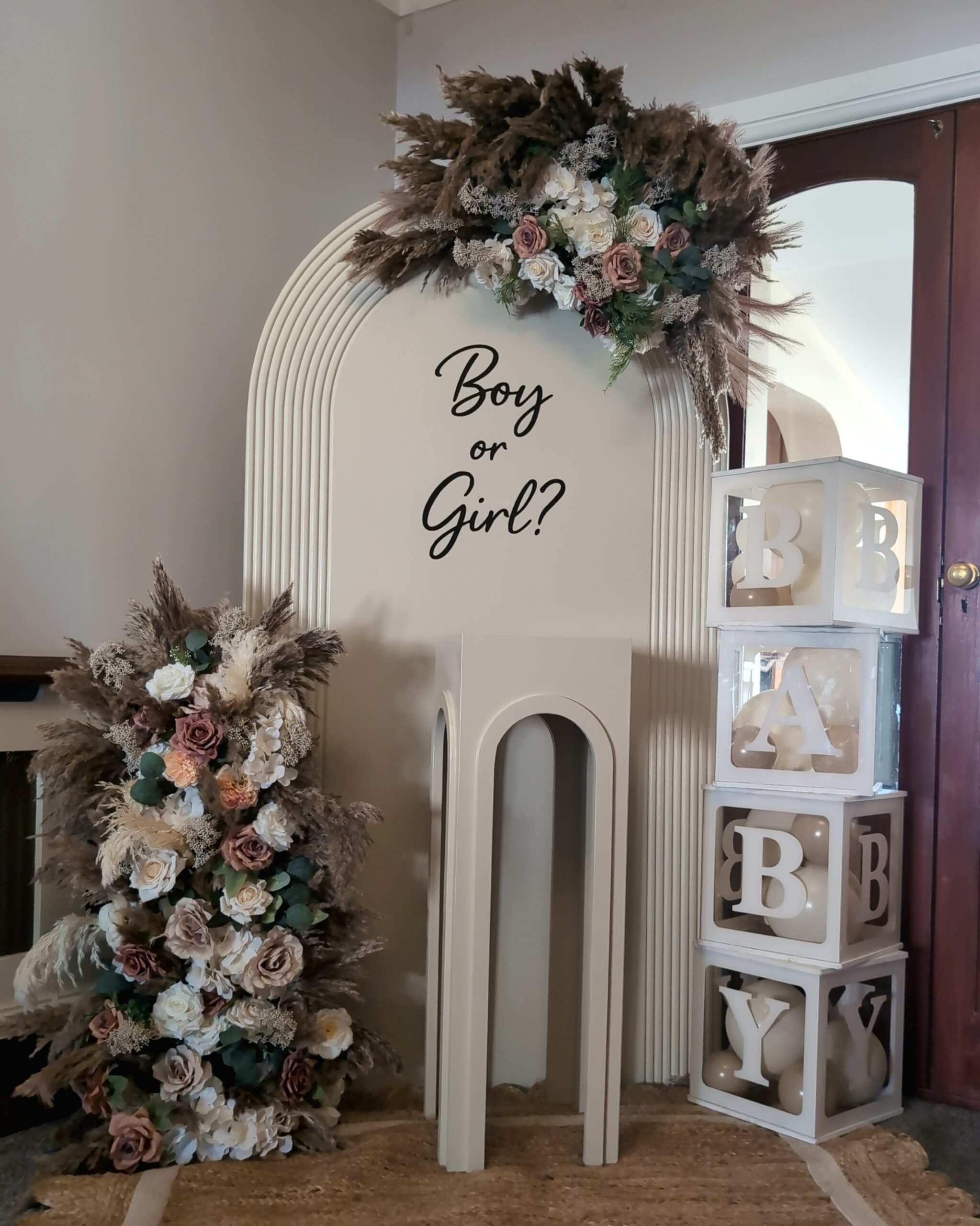 The backdrop featured a neutral-toned arch with “Boy or Girl?” signage, styled with cascading pampas grass and florals in cream, blush, and soft earthy tones. This added warmth and texture while keeping the design sophisticated.