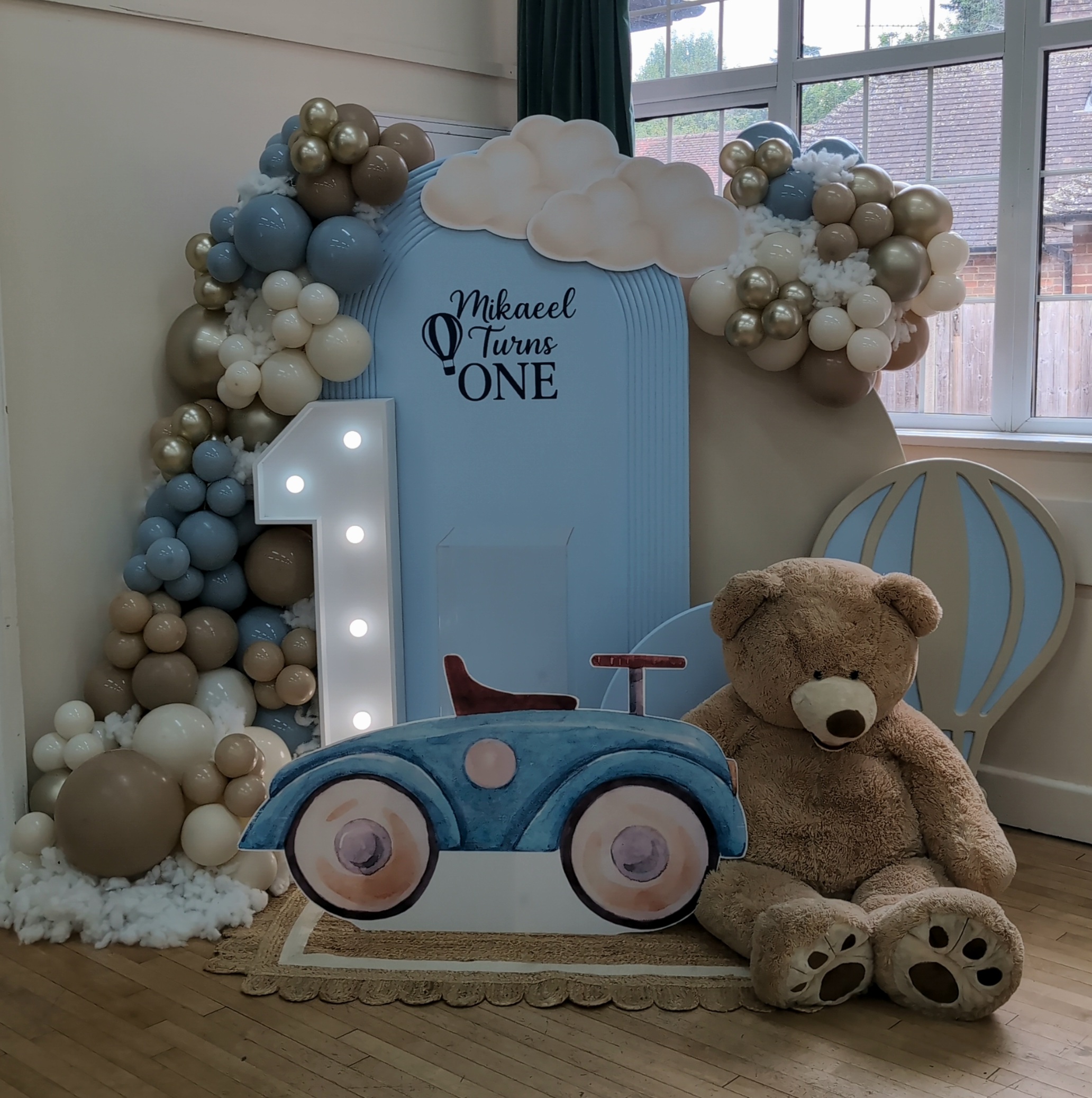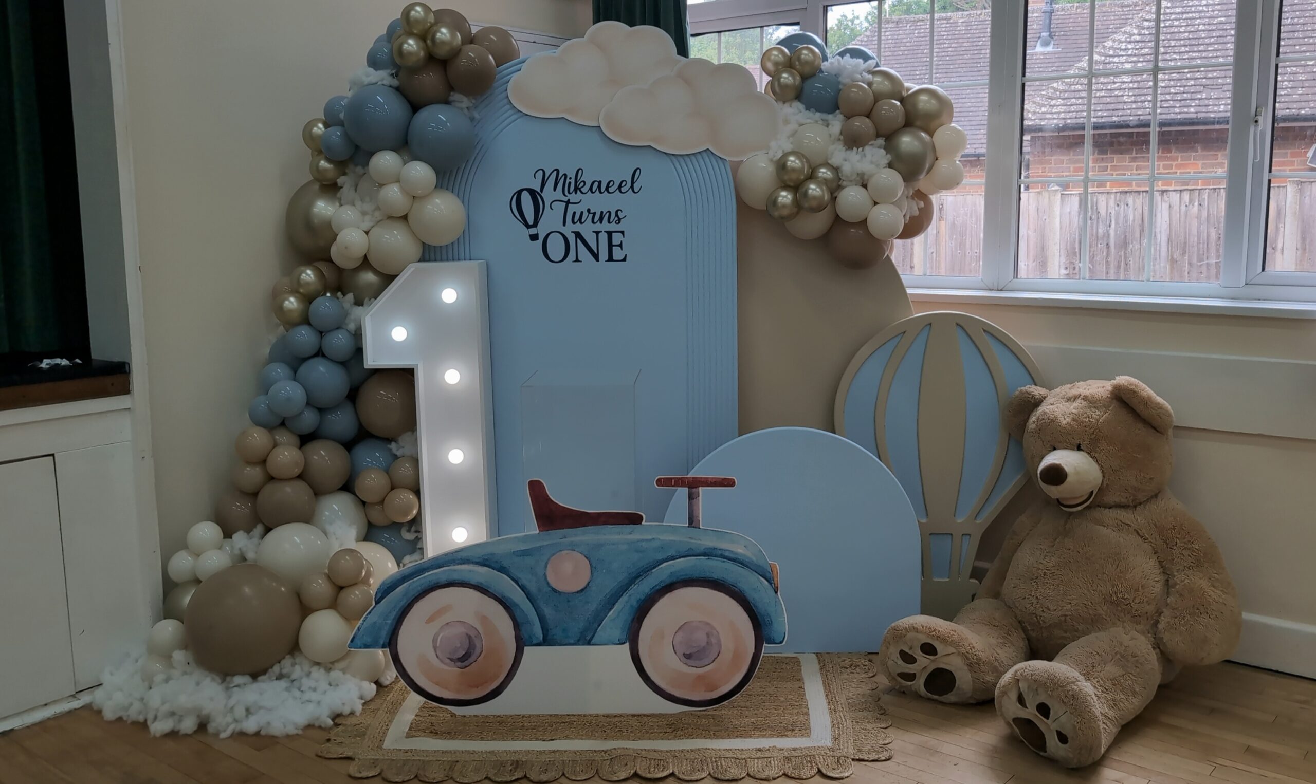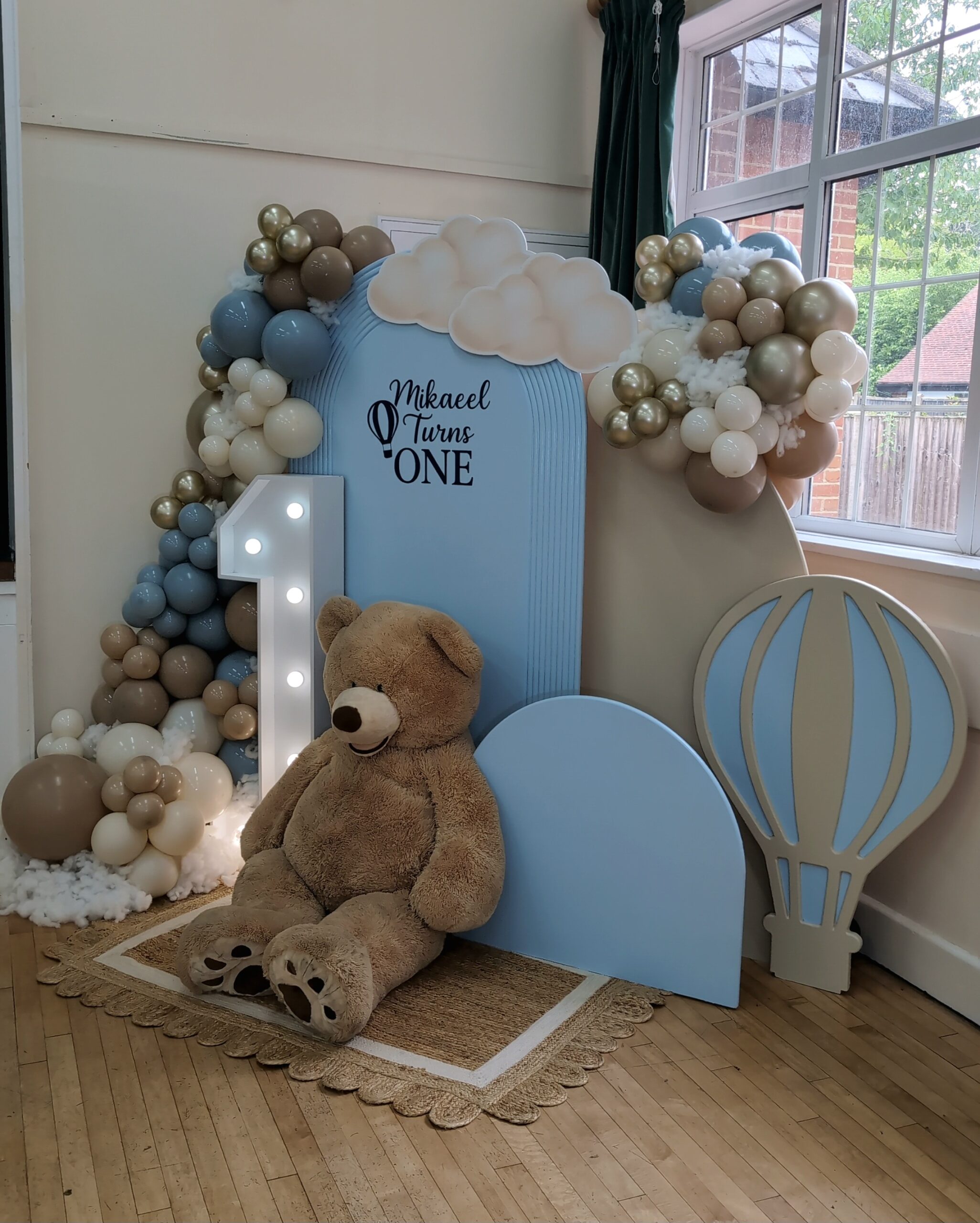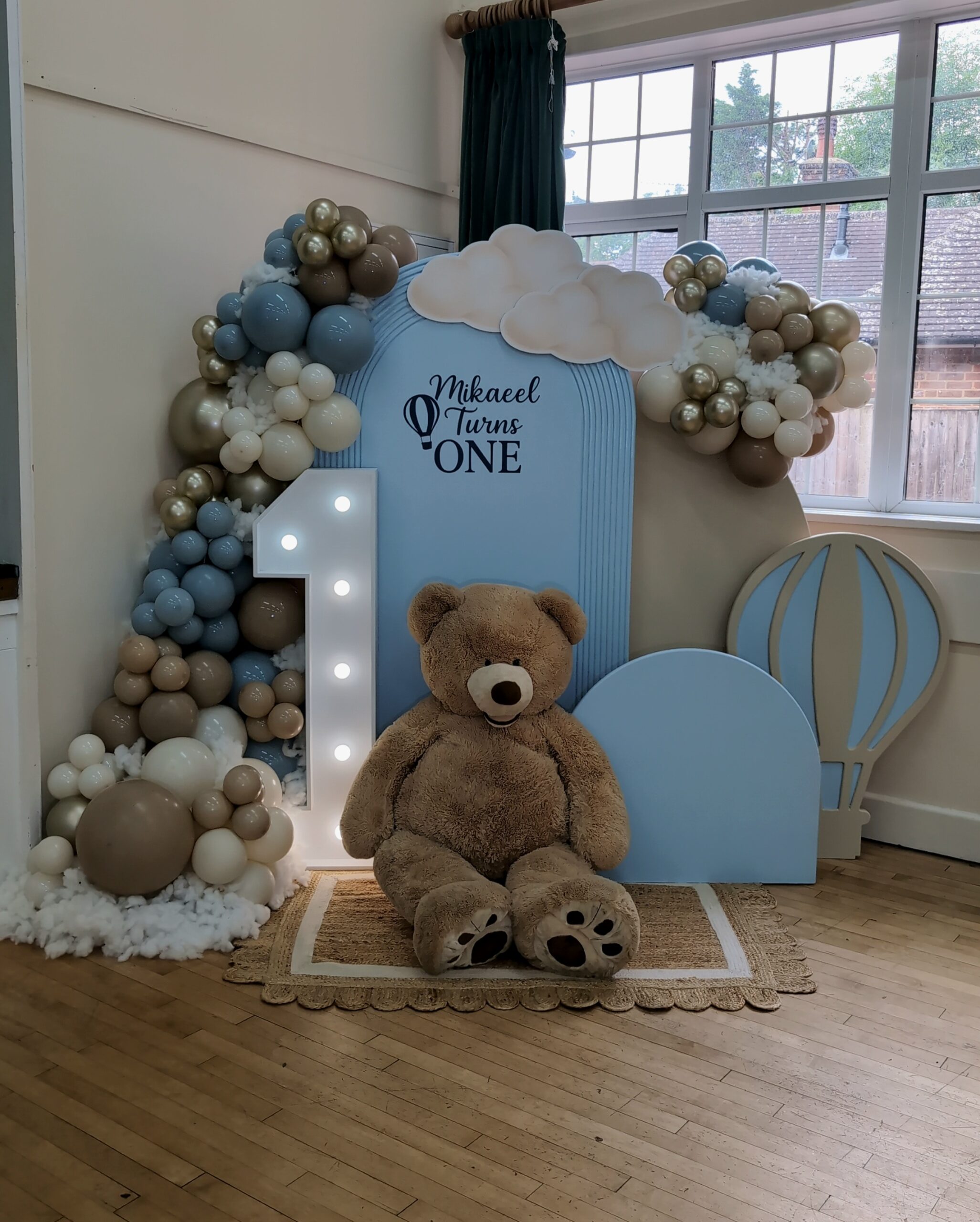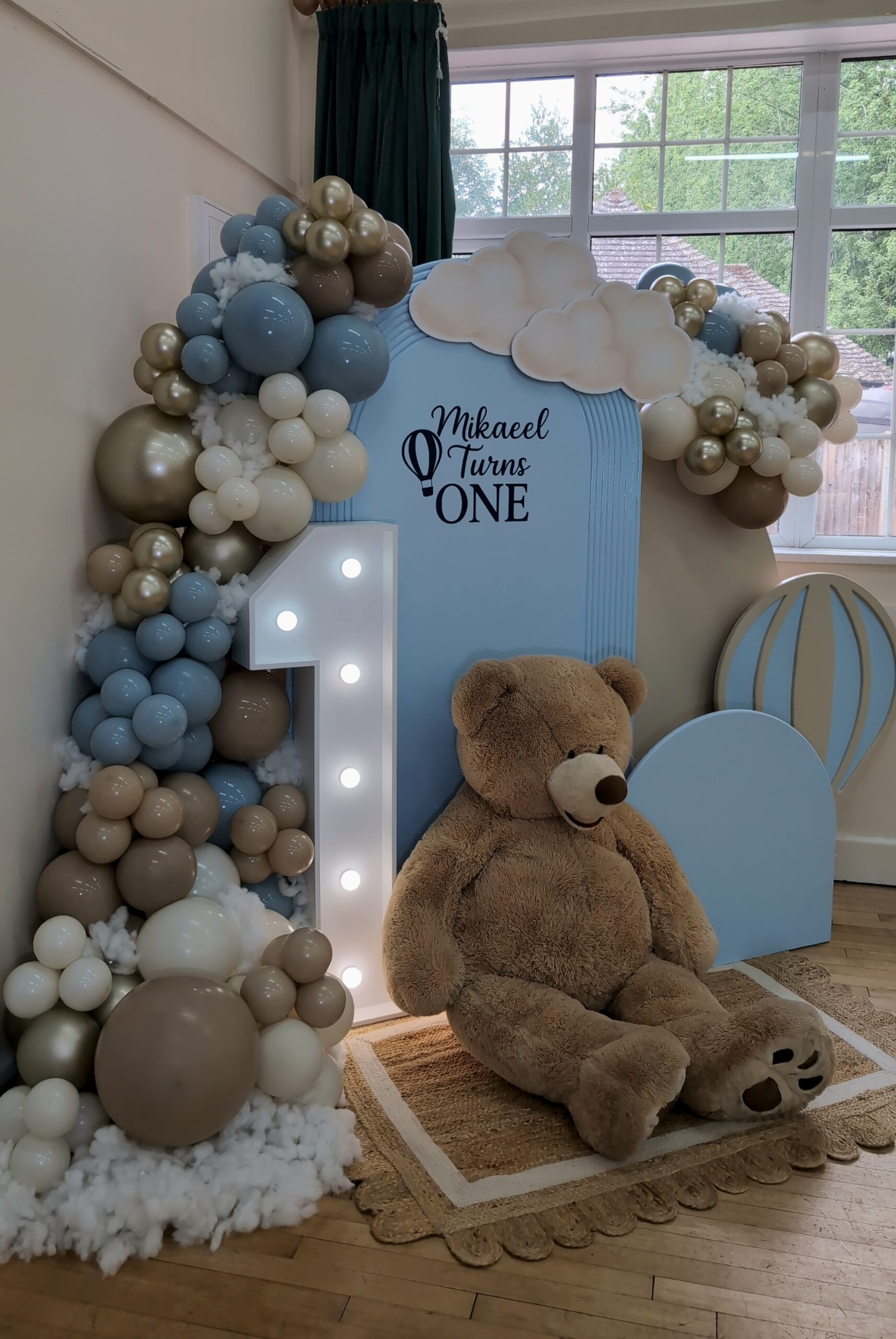 The centrepiece featured a tall arched backdrop with Mikaeel’s name and the words “Turns One”, topped with fluffy cloud cutouts for a whimsical feel. A giant teddy bear sat in front, adding an adorable touch to the scene, complemented by a number 1 light prop that illuminated the display.