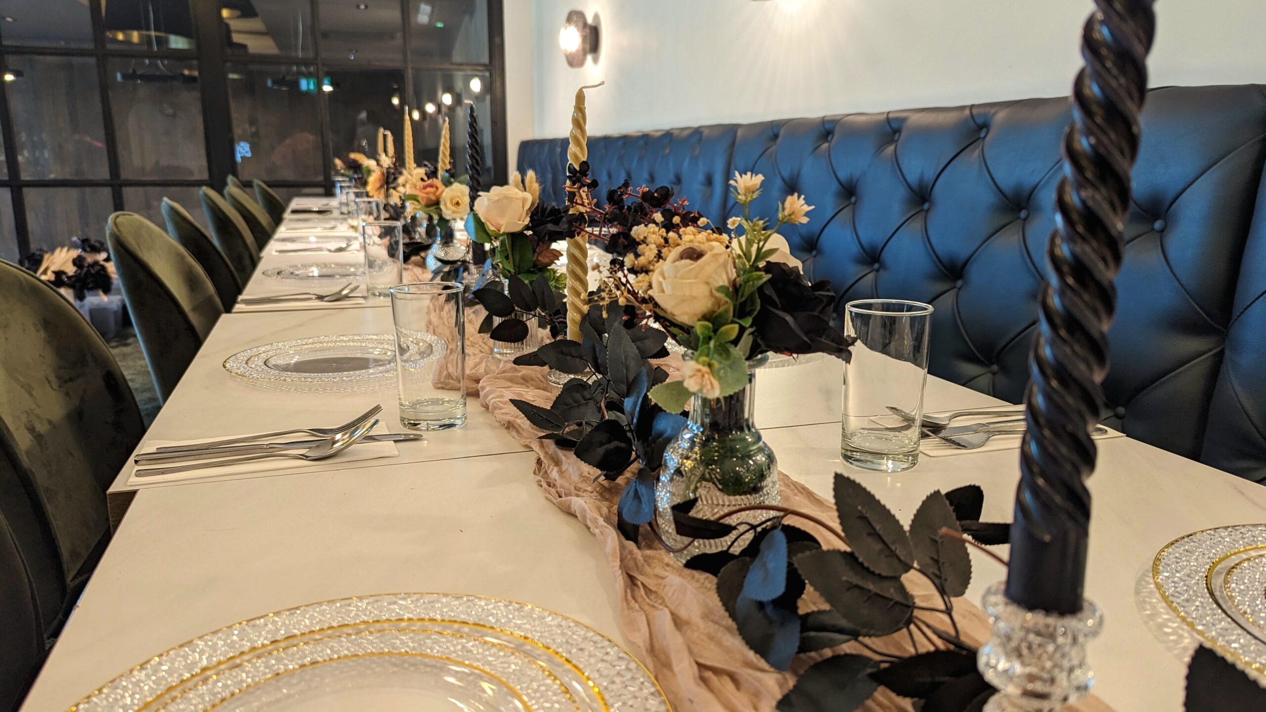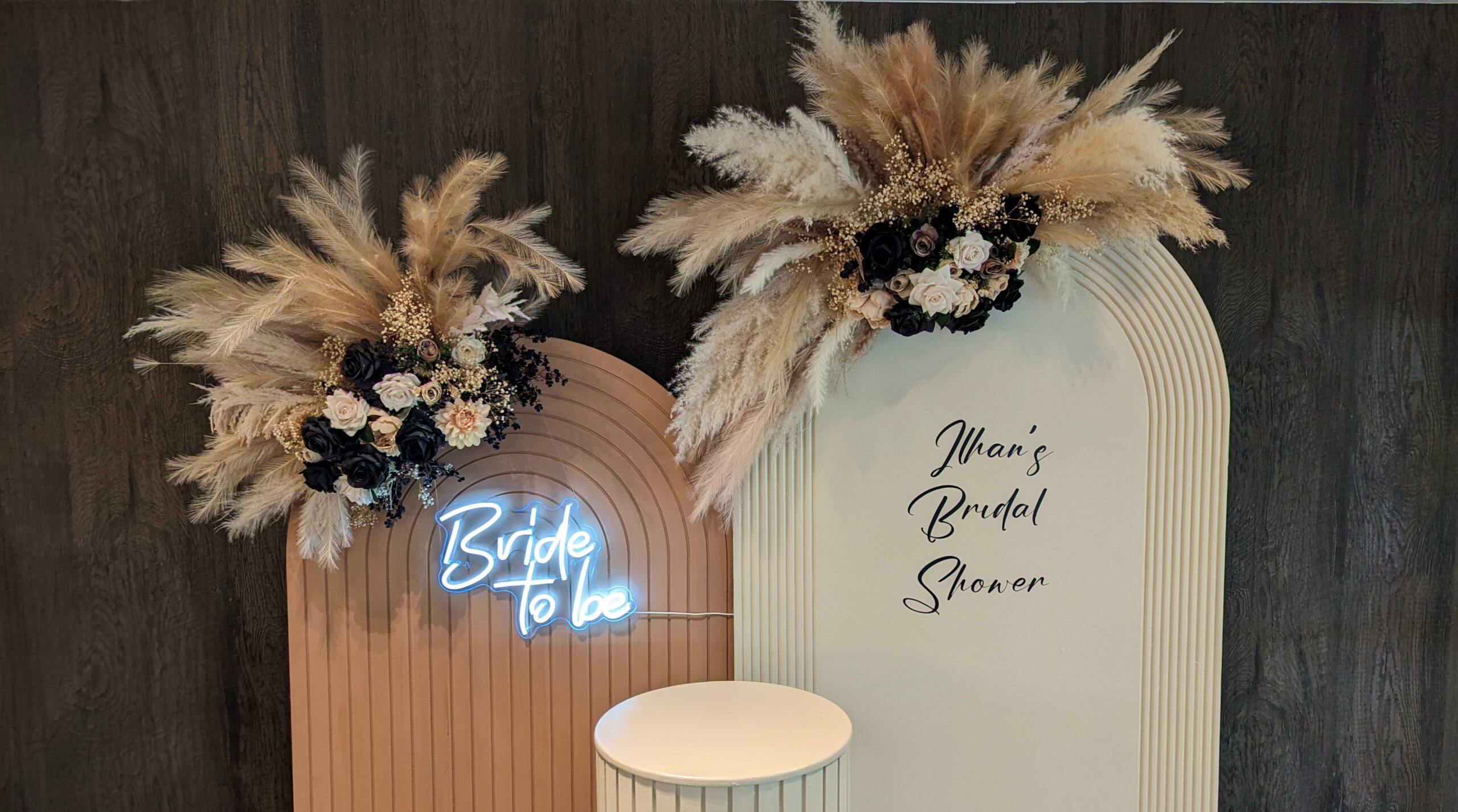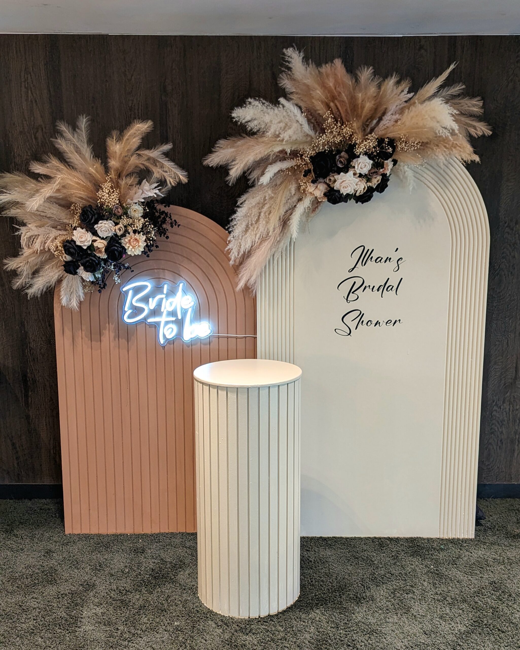 For Ilhan’s bridal shower, we styled a beautifully intimate celebration at Shere Khan, Feltham, blending earthy neutrals with contemporary luxury. The setup featured our signature ribbed backdrops dressed with lush pampas arrangements in tones of beige, cream, and soft blush, complemented by black and ivory roses for a bold, modern contrast. A “Bride to Be” neon sign added a touch of glow, while the elegant tablescape was finished with textured runners, gold and black taper candles, and crystal vases filled with dried florals.
