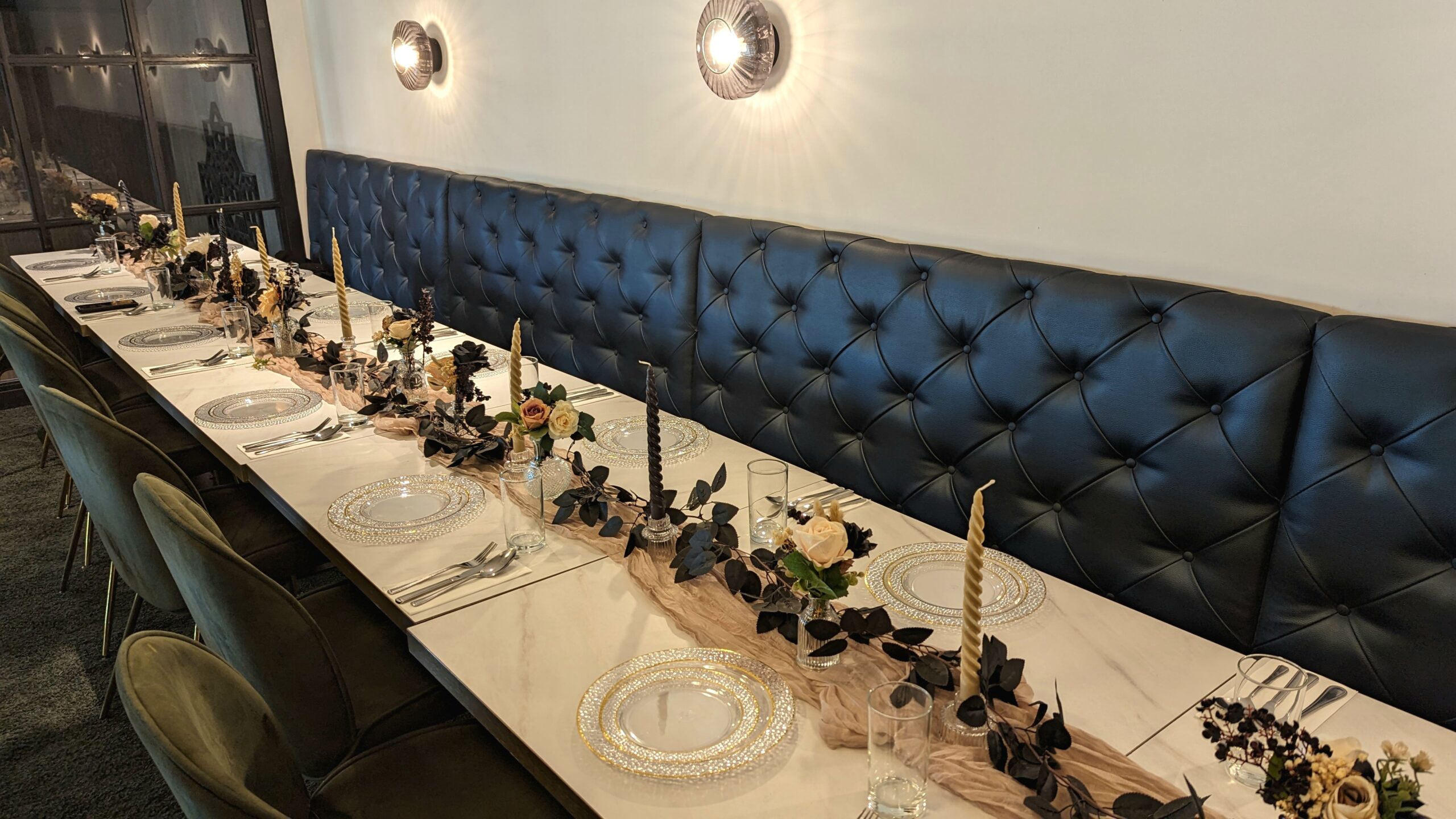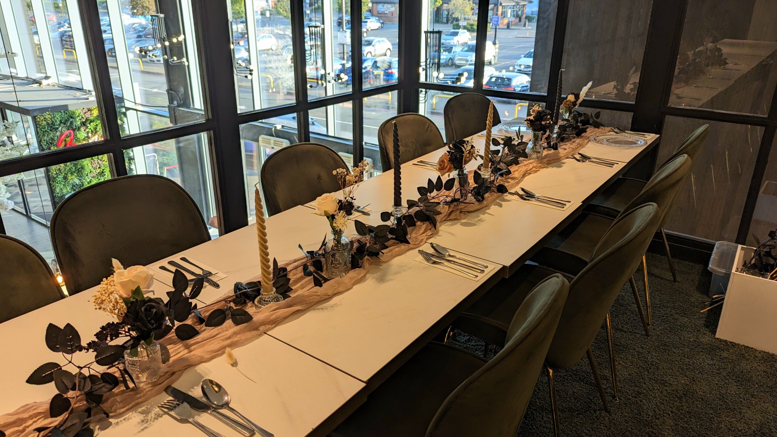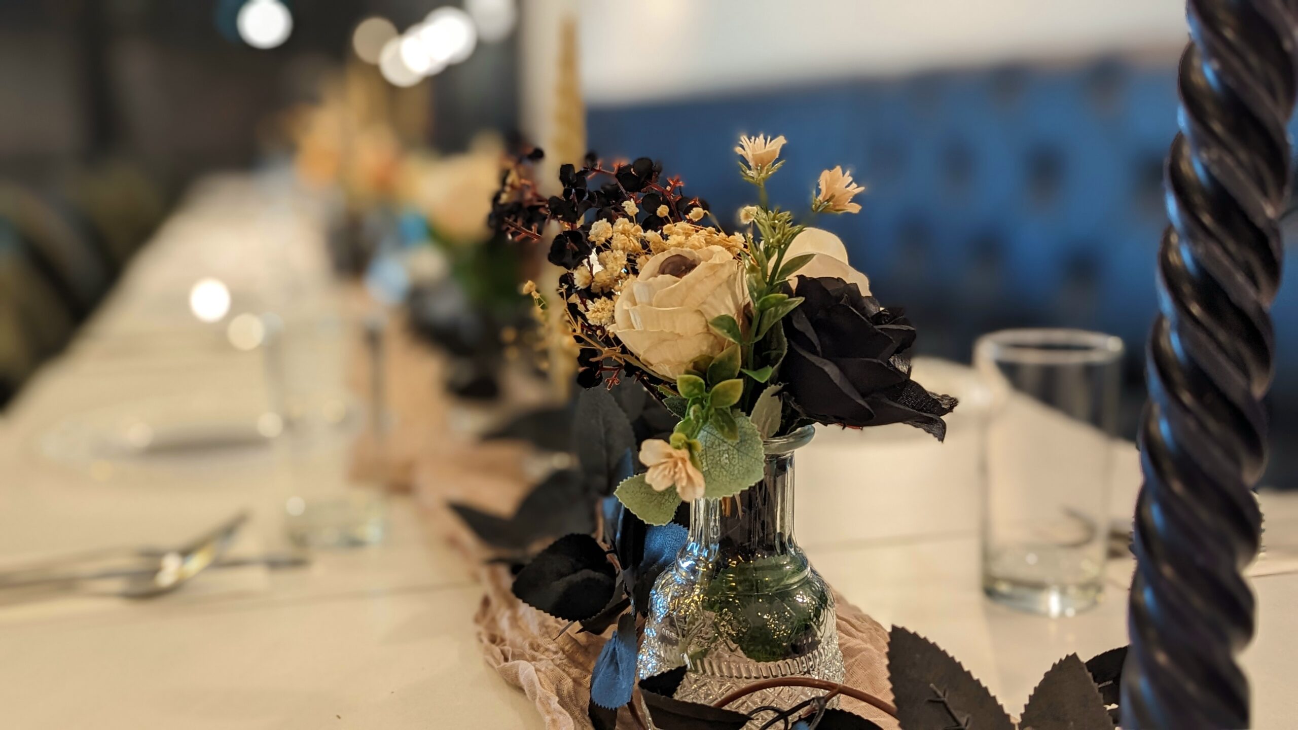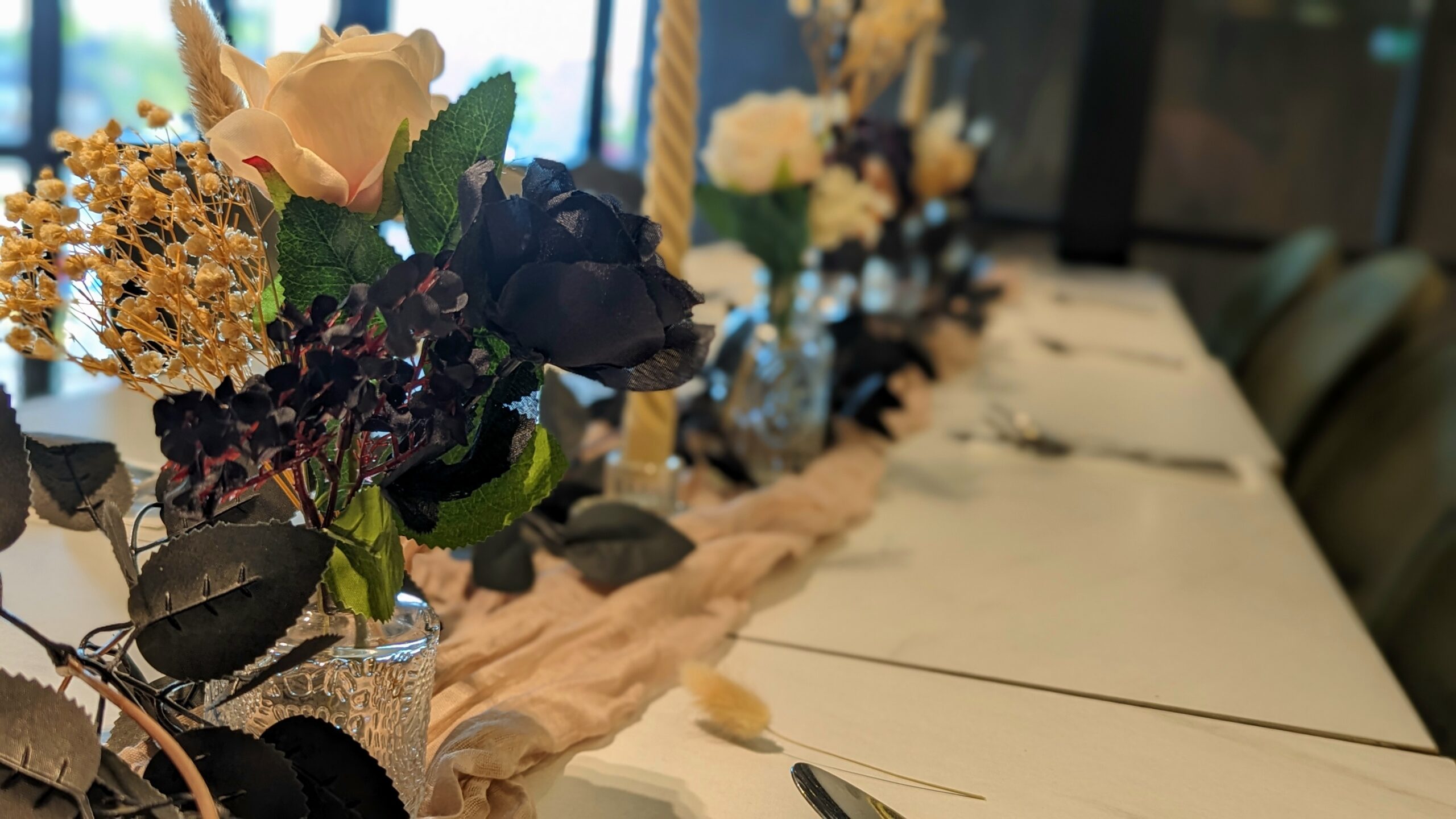 For Ilhan’s bridal shower, we styled a beautifully intimate celebration at Shere Khan, Feltham, blending earthy neutrals with contemporary luxury. The setup featured our signature ribbed backdrops dressed with lush pampas arrangements in tones of beige, cream, and soft blush, complemented by black and ivory roses for a bold, modern contrast. A “Bride to Be” neon sign added a touch of glow, while the elegant tablescape was finished with textured runners, gold and black taper candles, and crystal vases filled with dried florals.