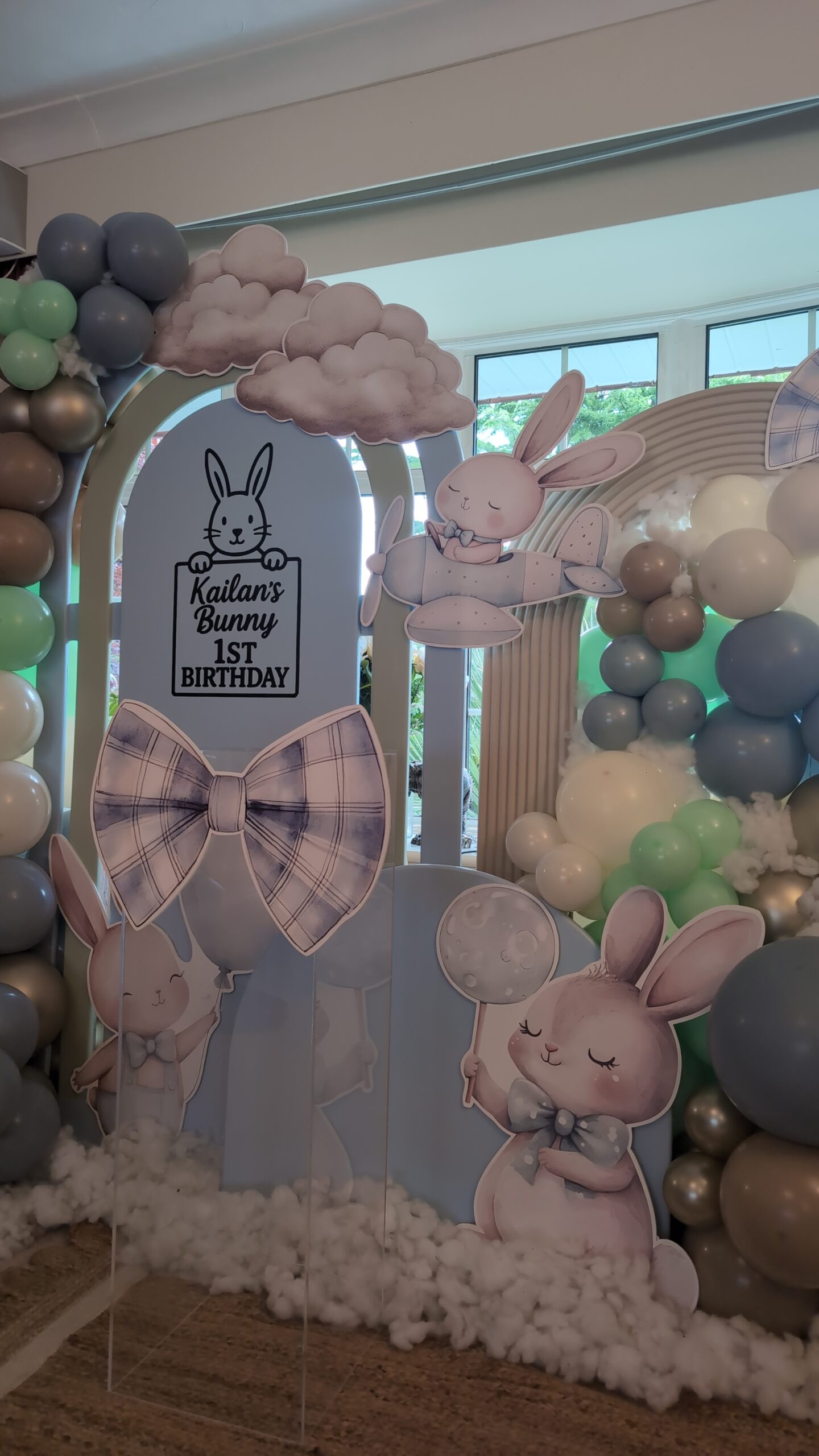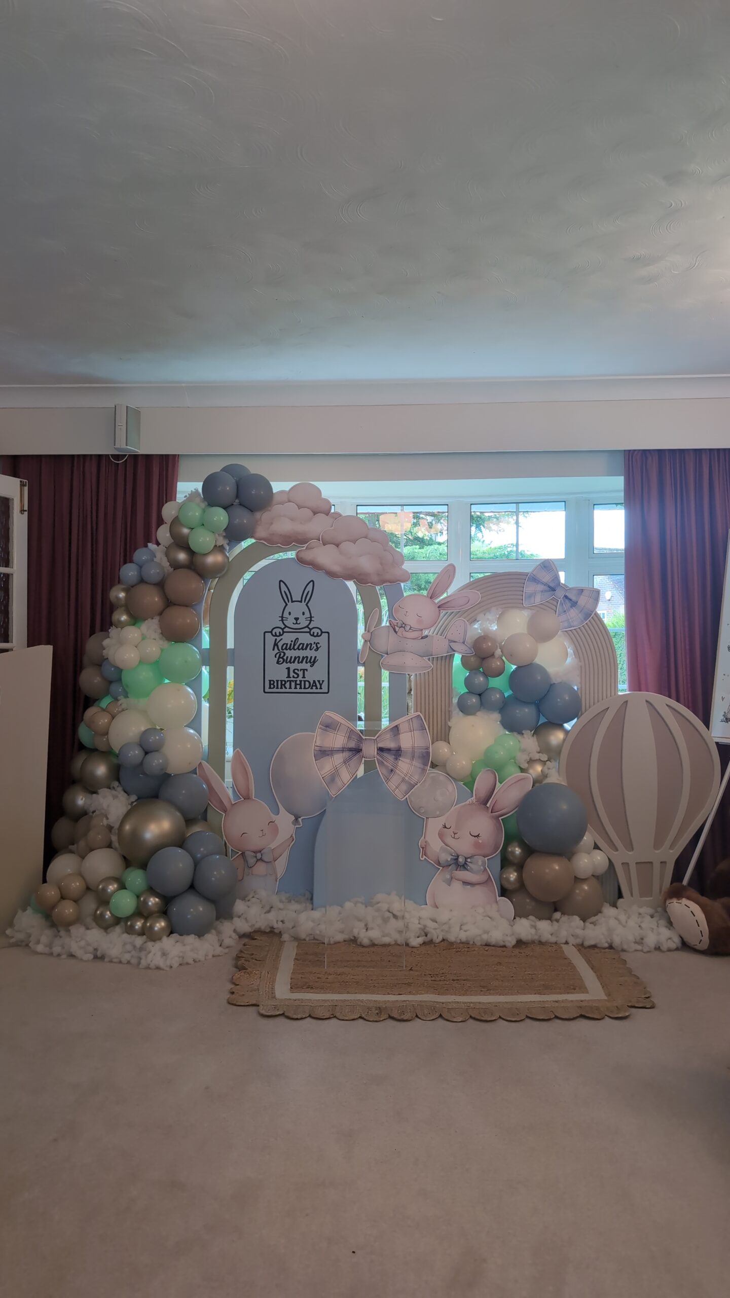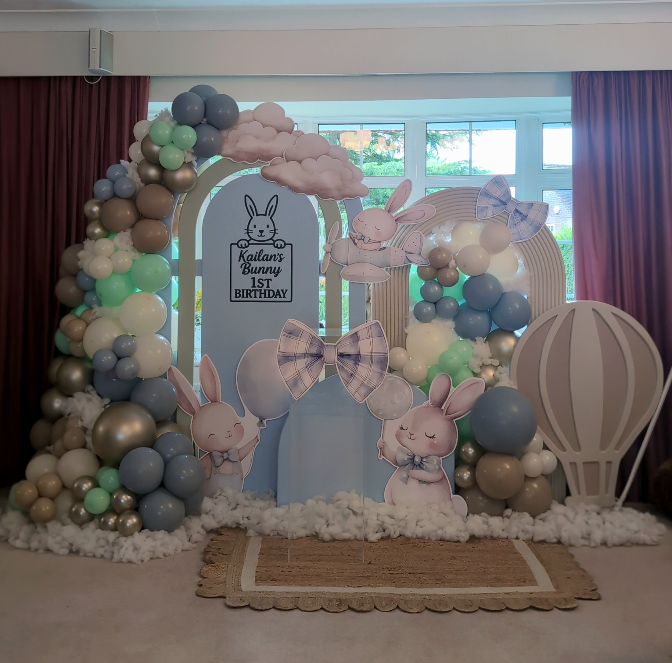 The backdrop featured a personalised panel with matching bunny cut-outs, surrounded by a delicate balloon garland in mint, beige and ivory tones. Finishing touches like plaid bows, clouds and a woven rug added warmth and texture, creating the perfect cosy-yet-luxurious setting for a first birthday celebration.