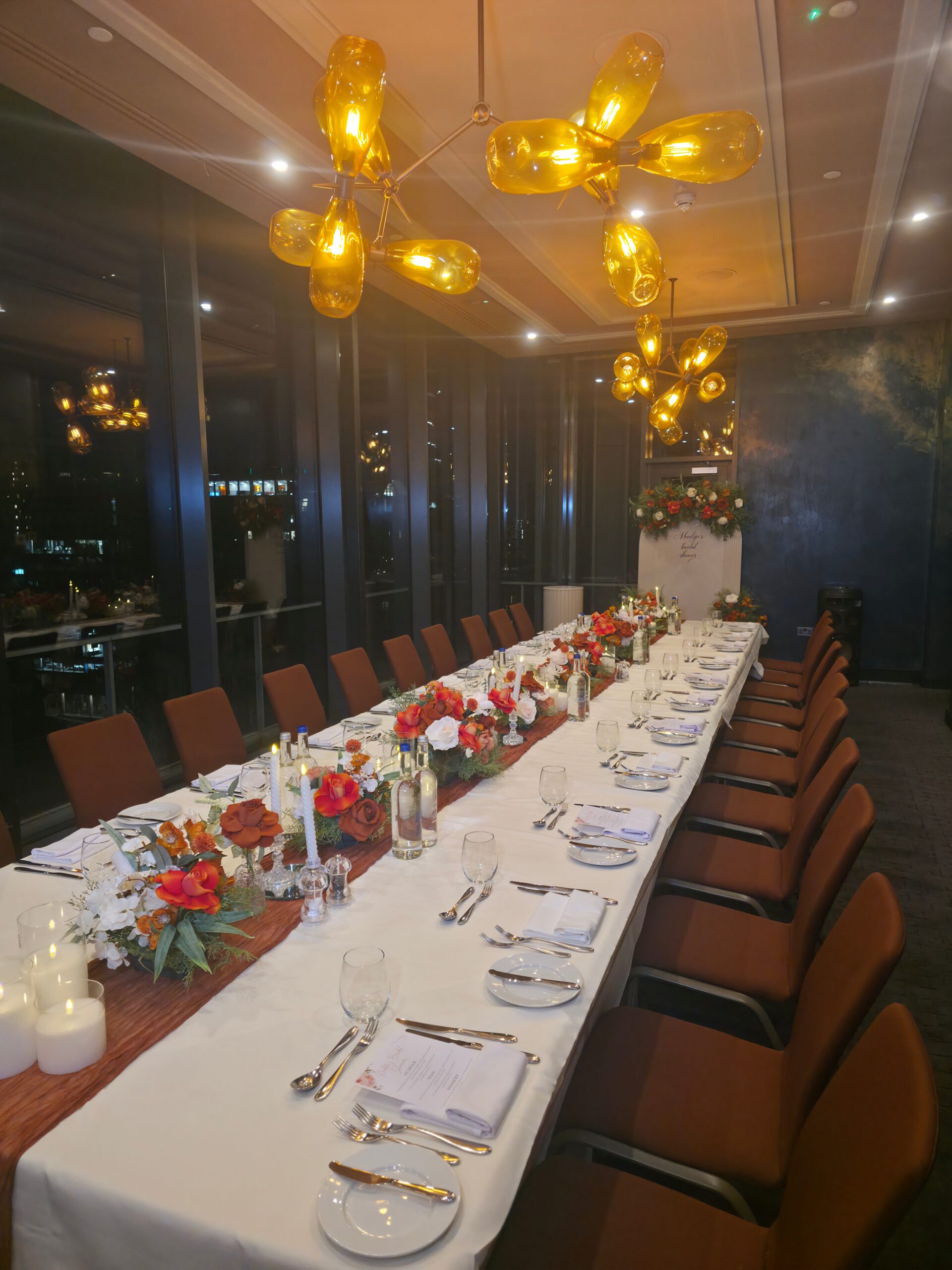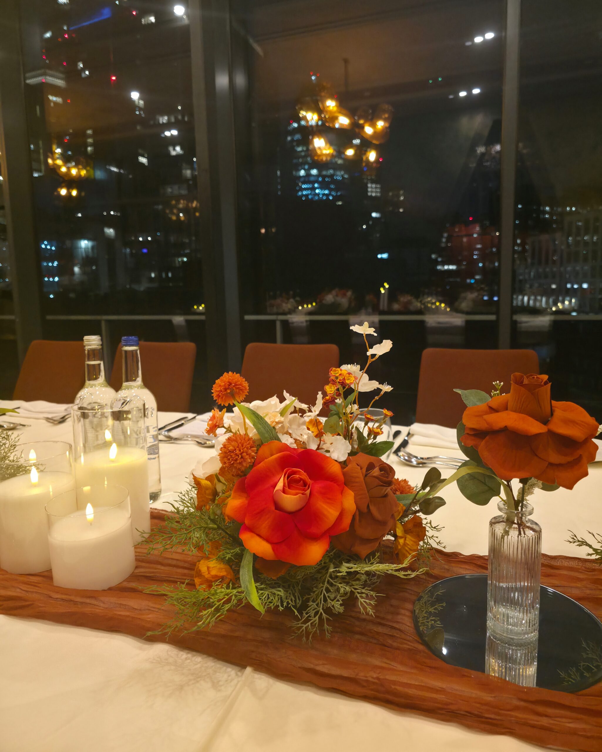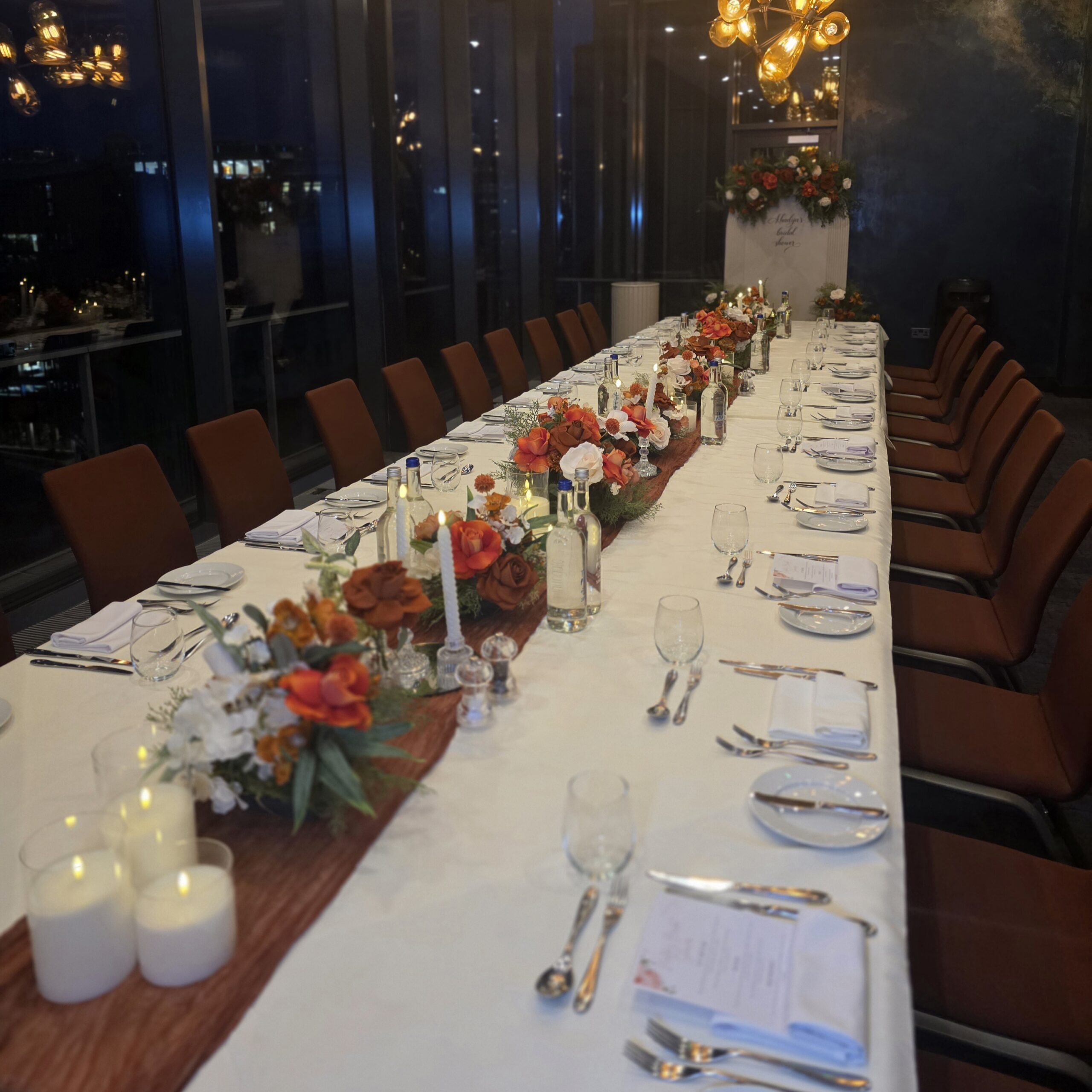 For the dining area, we delivered full tablescaping from start to finish. Long tables were dressed with crisp linens, textured runners and layered floral centrepieces that flowed seamlessly down the length of the table. Candlelight, glassware and carefully styled place settings added warmth and intimacy, while the city skyline views created a stunning evening ambience.