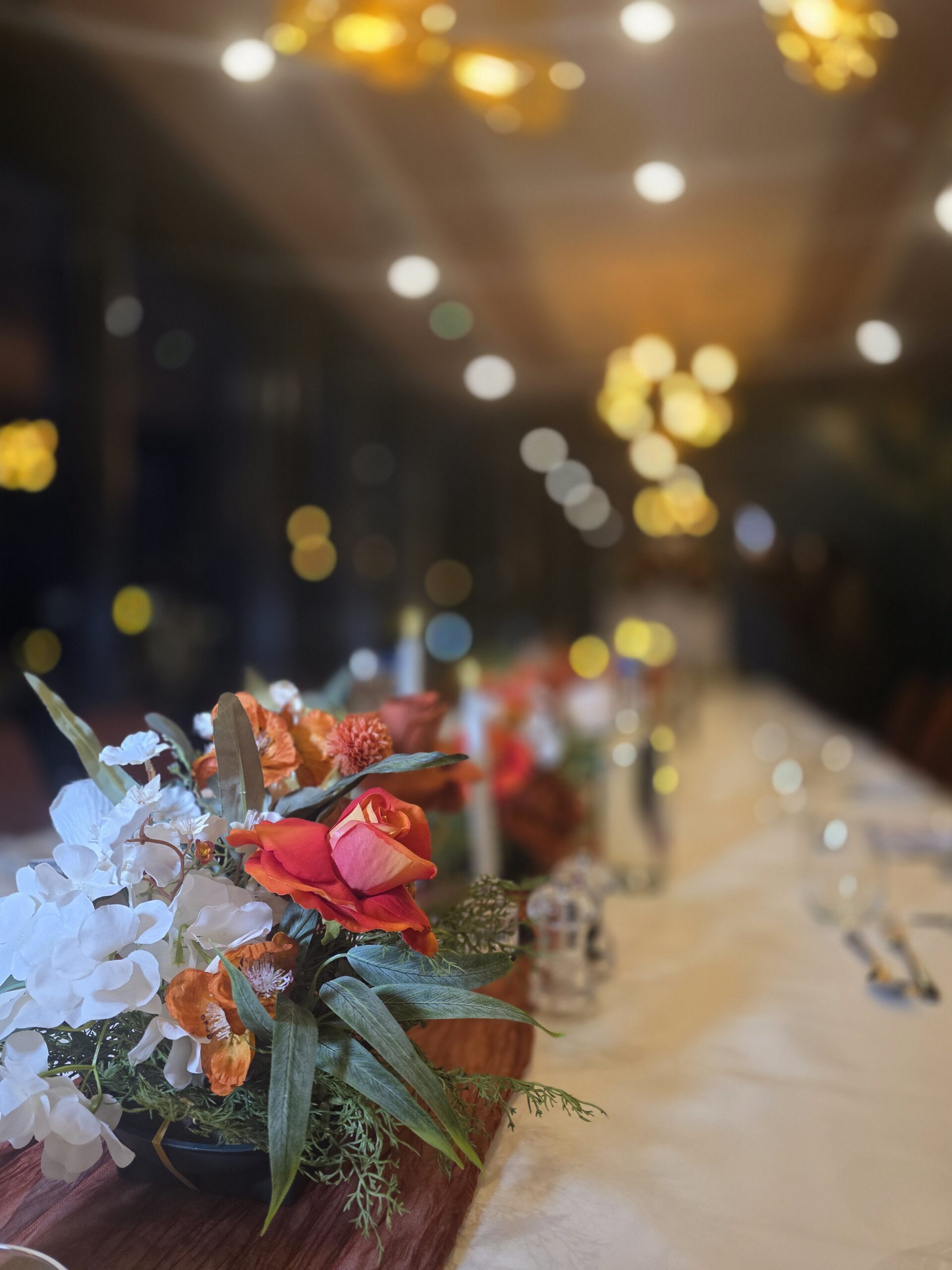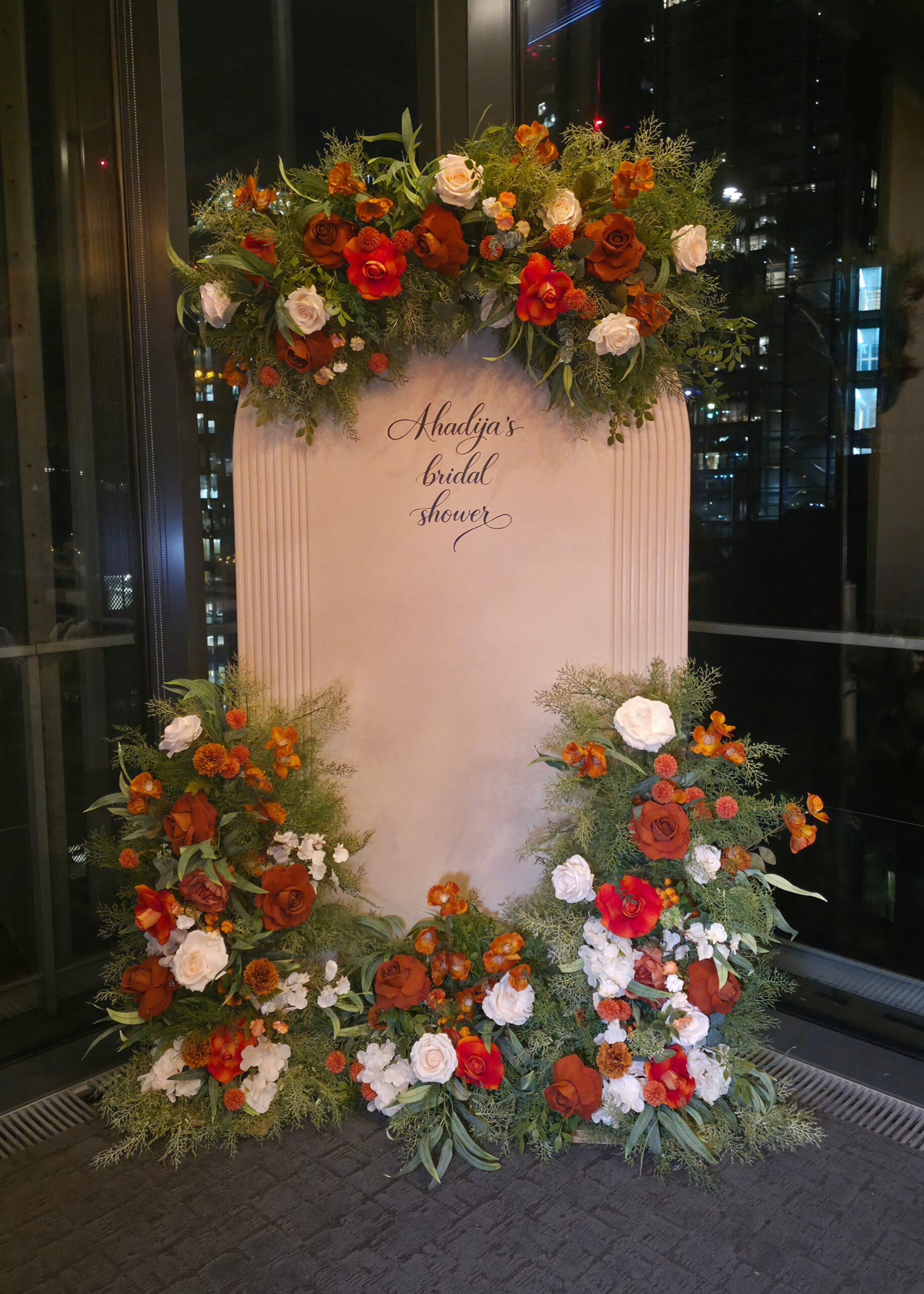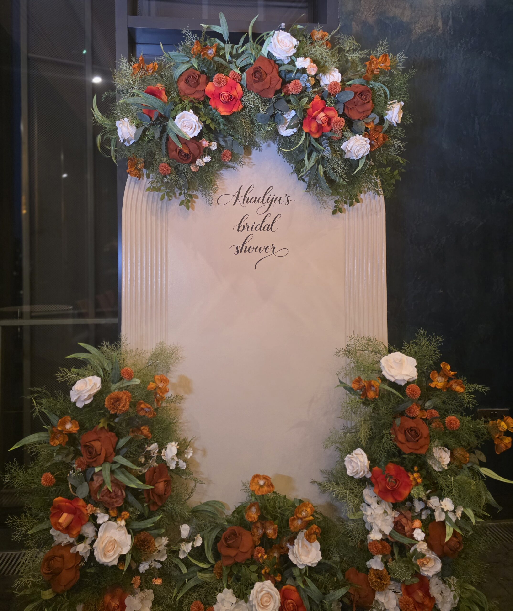 We began with a personalised statement backdrop, featuring a soft white arched panel finished with bespoke signage and framed with lush autumn-inspired florals in rich rust, burnt orange, cream and fresh greenery. The backdrop created a beautiful focal point for the room and tied the entire styling together, adding both height and softness to the space.