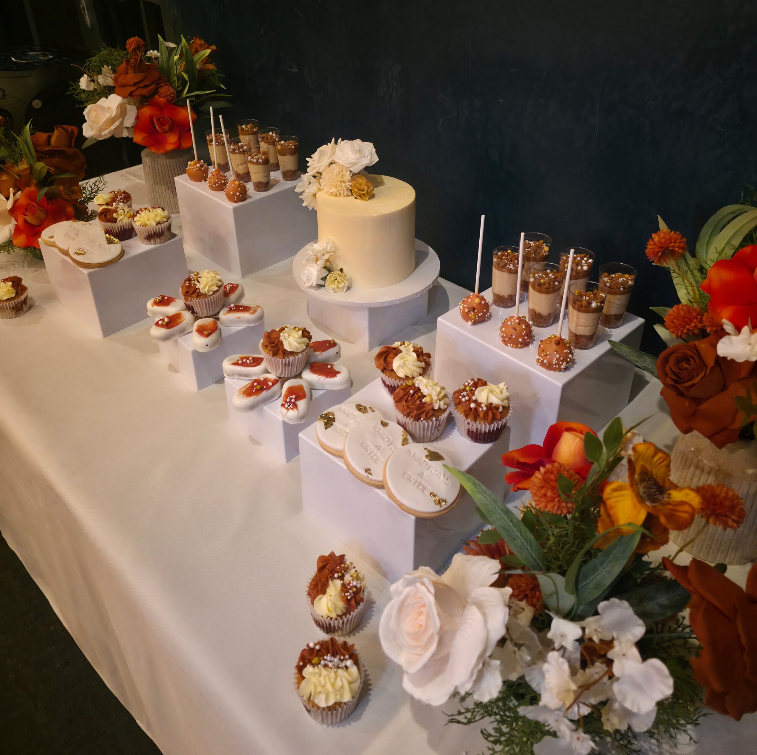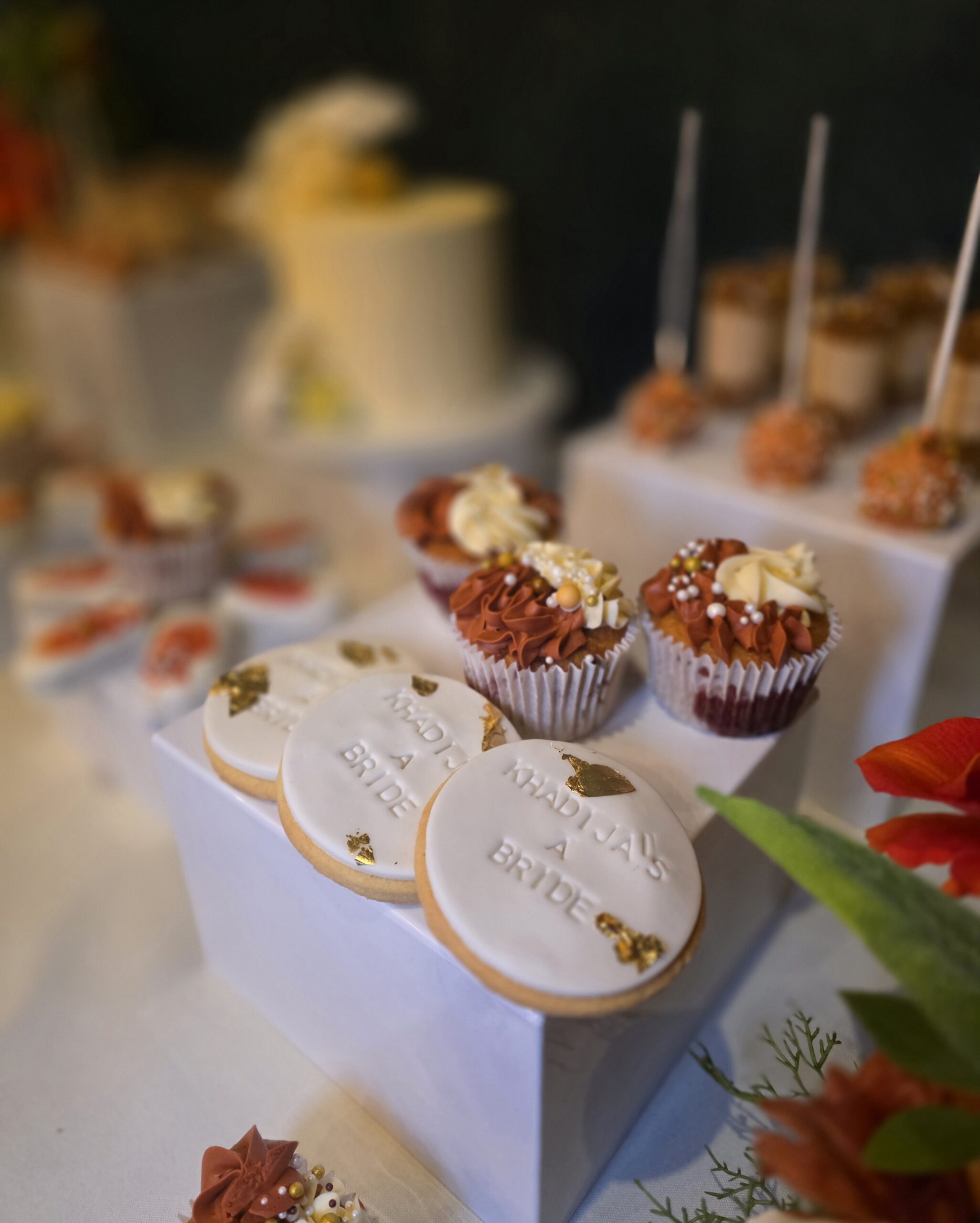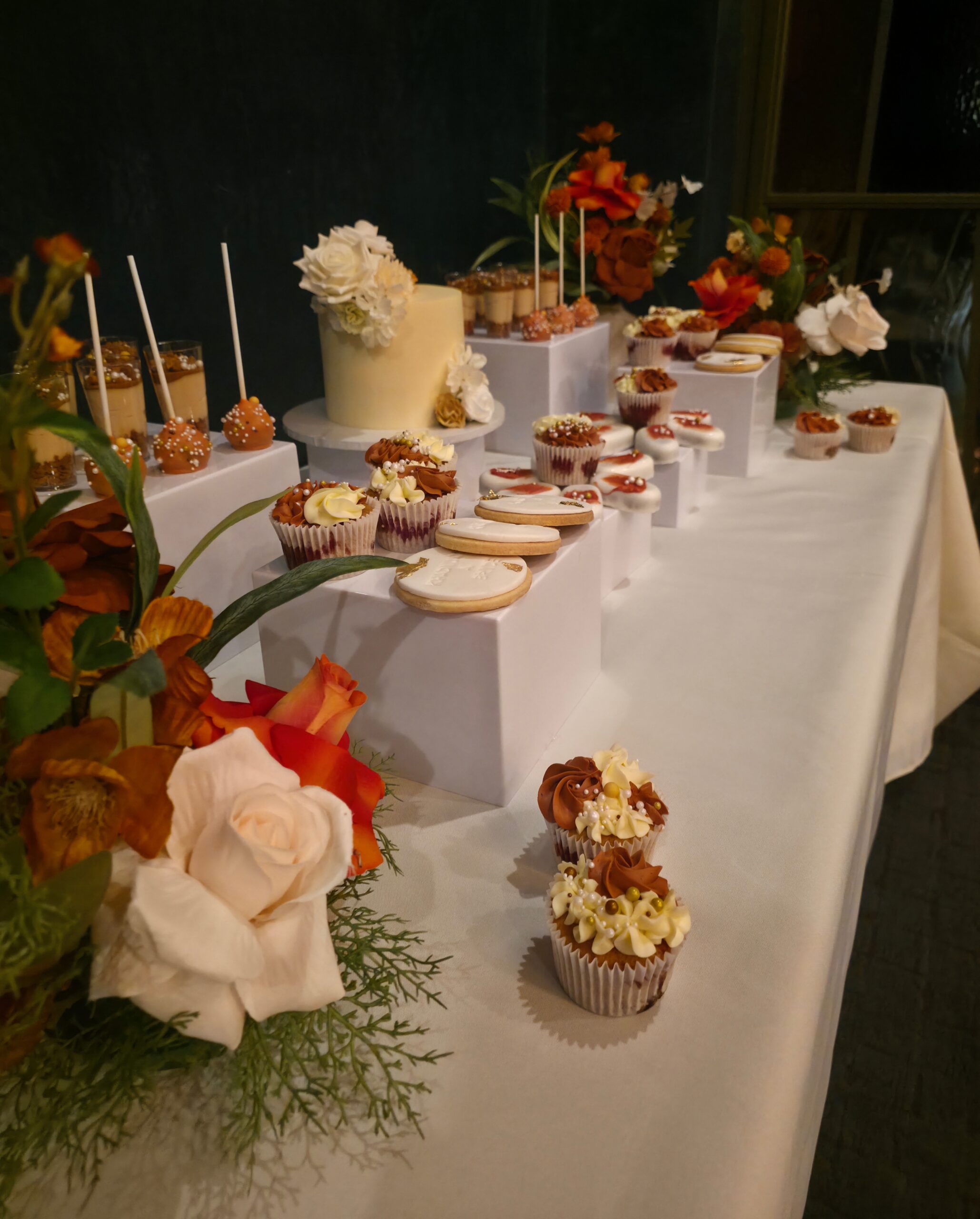 To complete the experience, we designed a coordinated dessert table that felt refined yet indulgent. Elevated plinths showcased a curated selection of desserts including cupcakes, cake pops, dessert cups, personalised cookies and a central cake, all styled to complement the colour palette and florals used throughout the event. The dessert table acted as a secondary feature point, balancing the backdrop and tablescape perfectly.