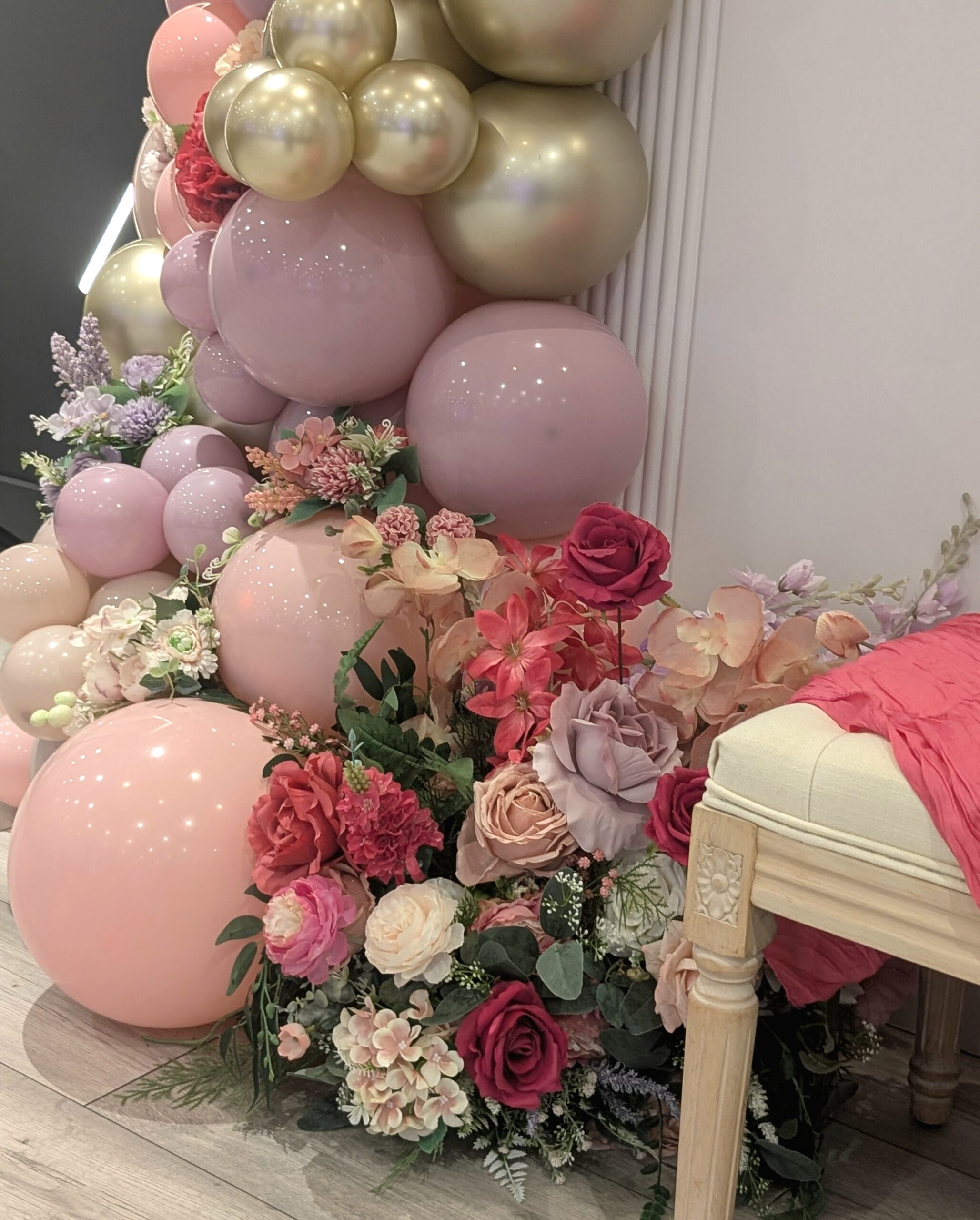 A soft draped bench in complementary pink and lilac tones provided the perfect seating area, accented with flowers and balloons at the base to complete the stage styling.