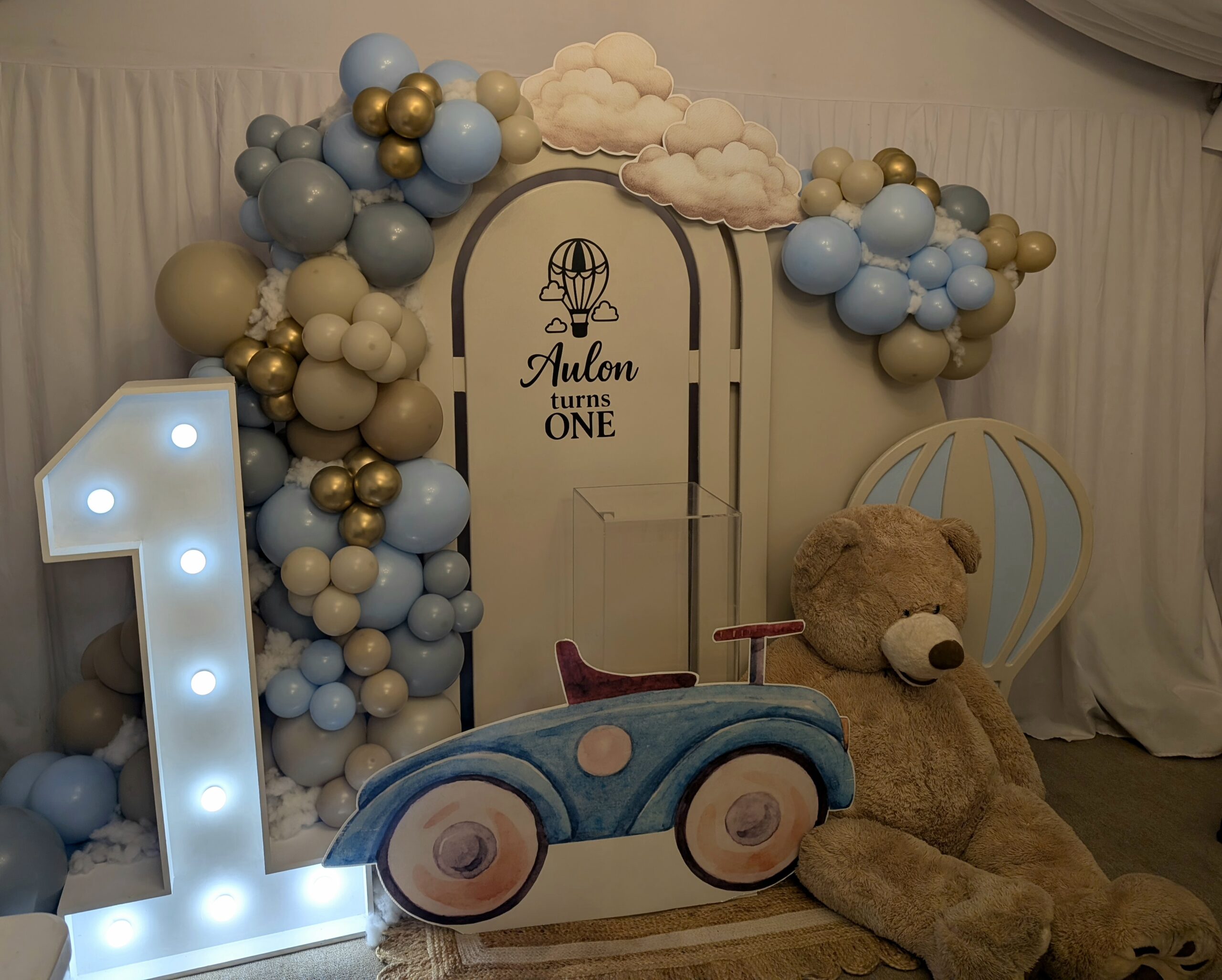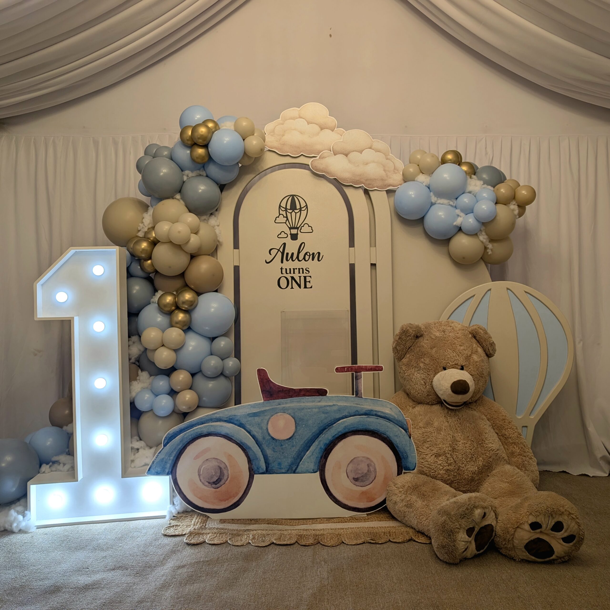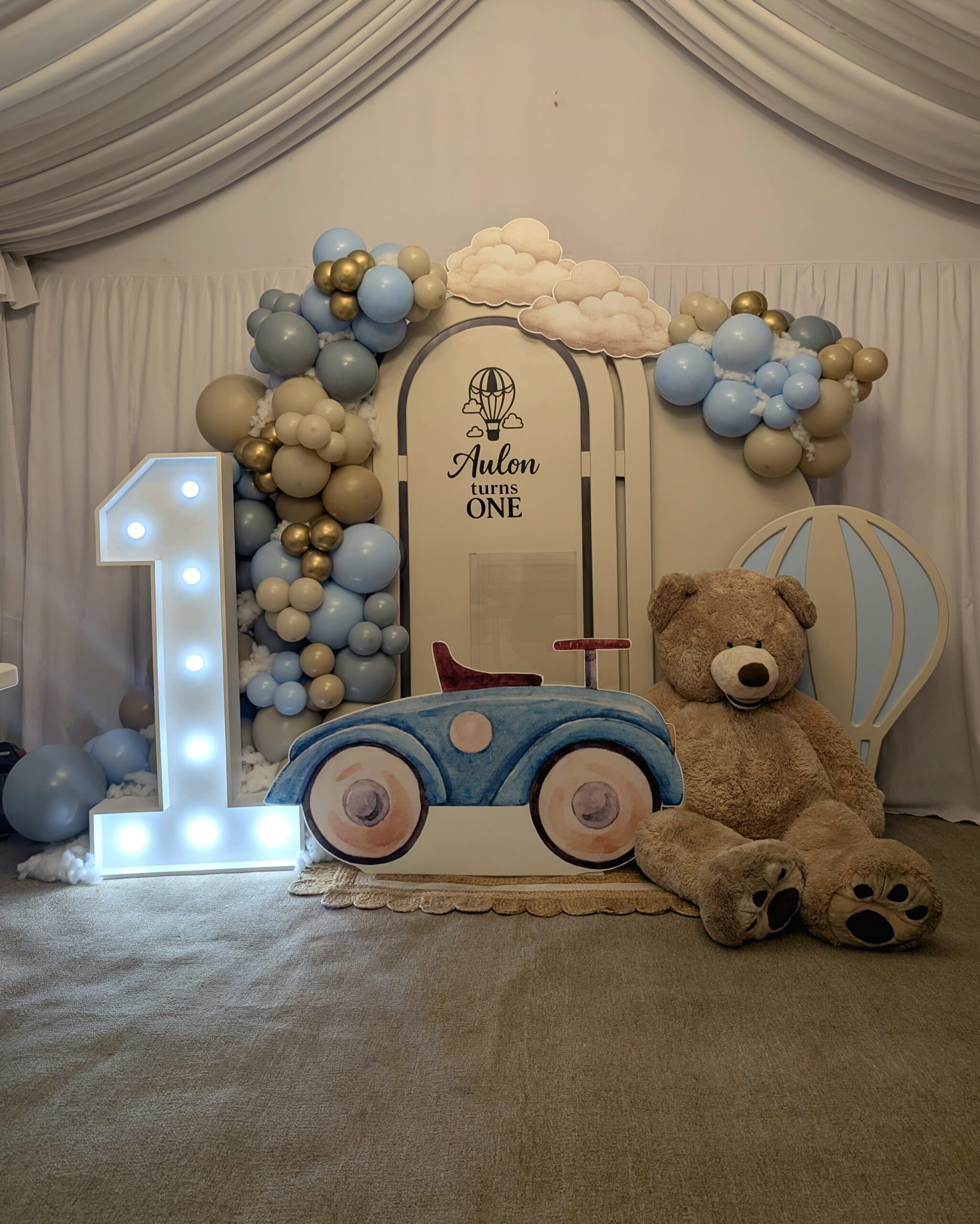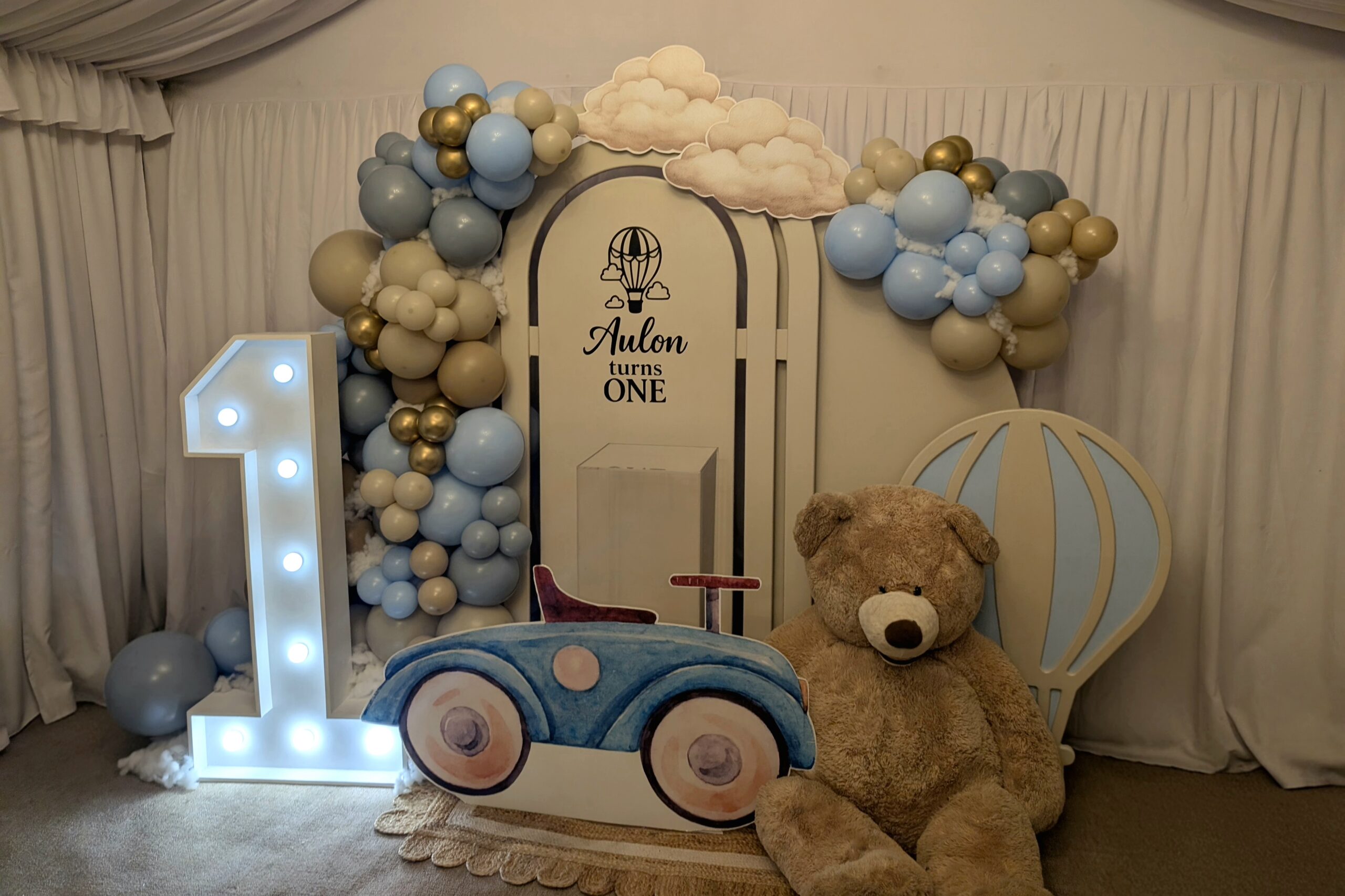 To complete the setup, we styled the space with a light-up number one, a classic teddy bear prop, and a charming vintage-style car cut-out, creating the perfect photo moment for family and guests. The hot air balloon elements tied the entire display together, giving the setup a whimsical, storybook feel that worked beautifully within the venue space.