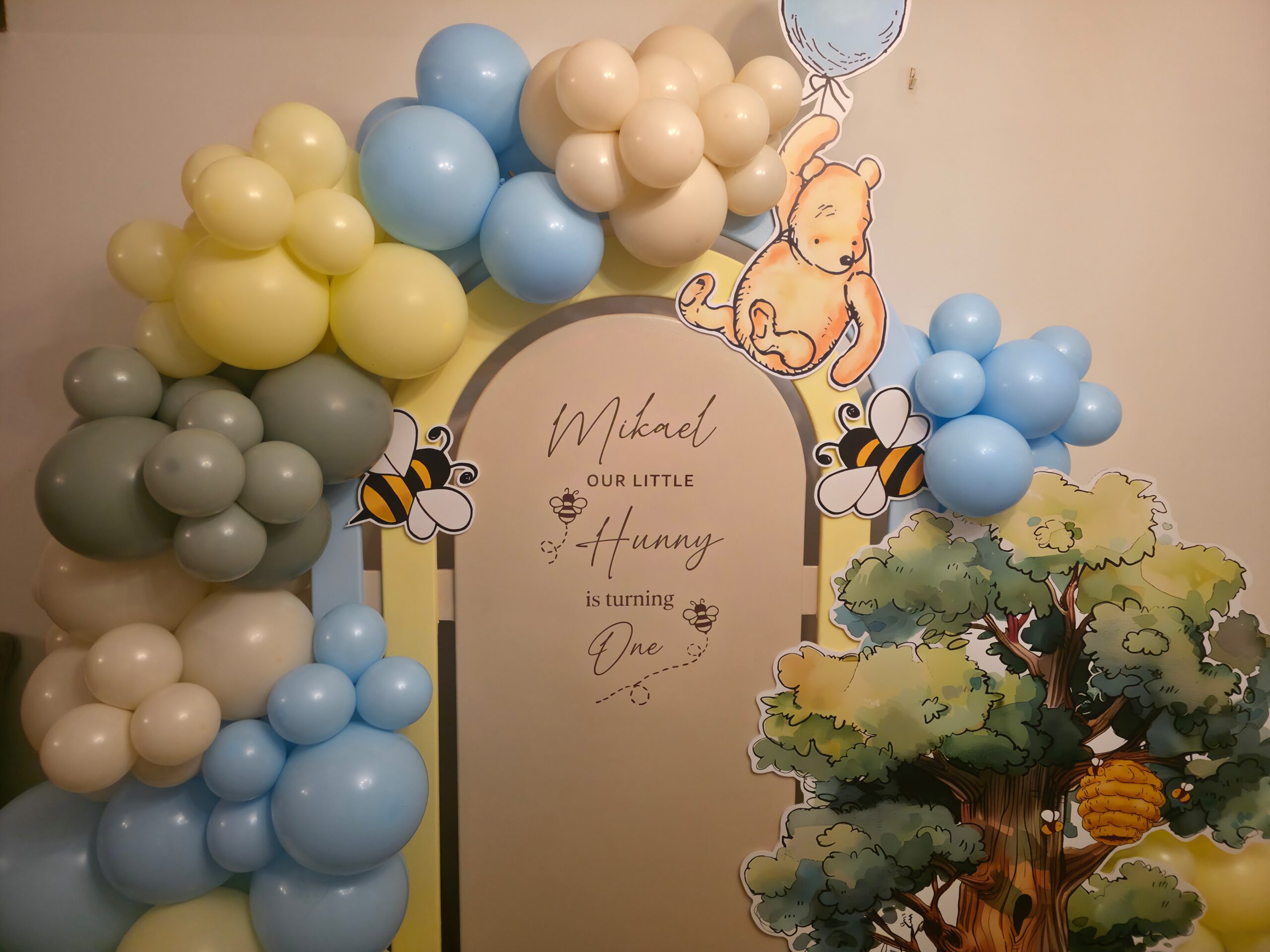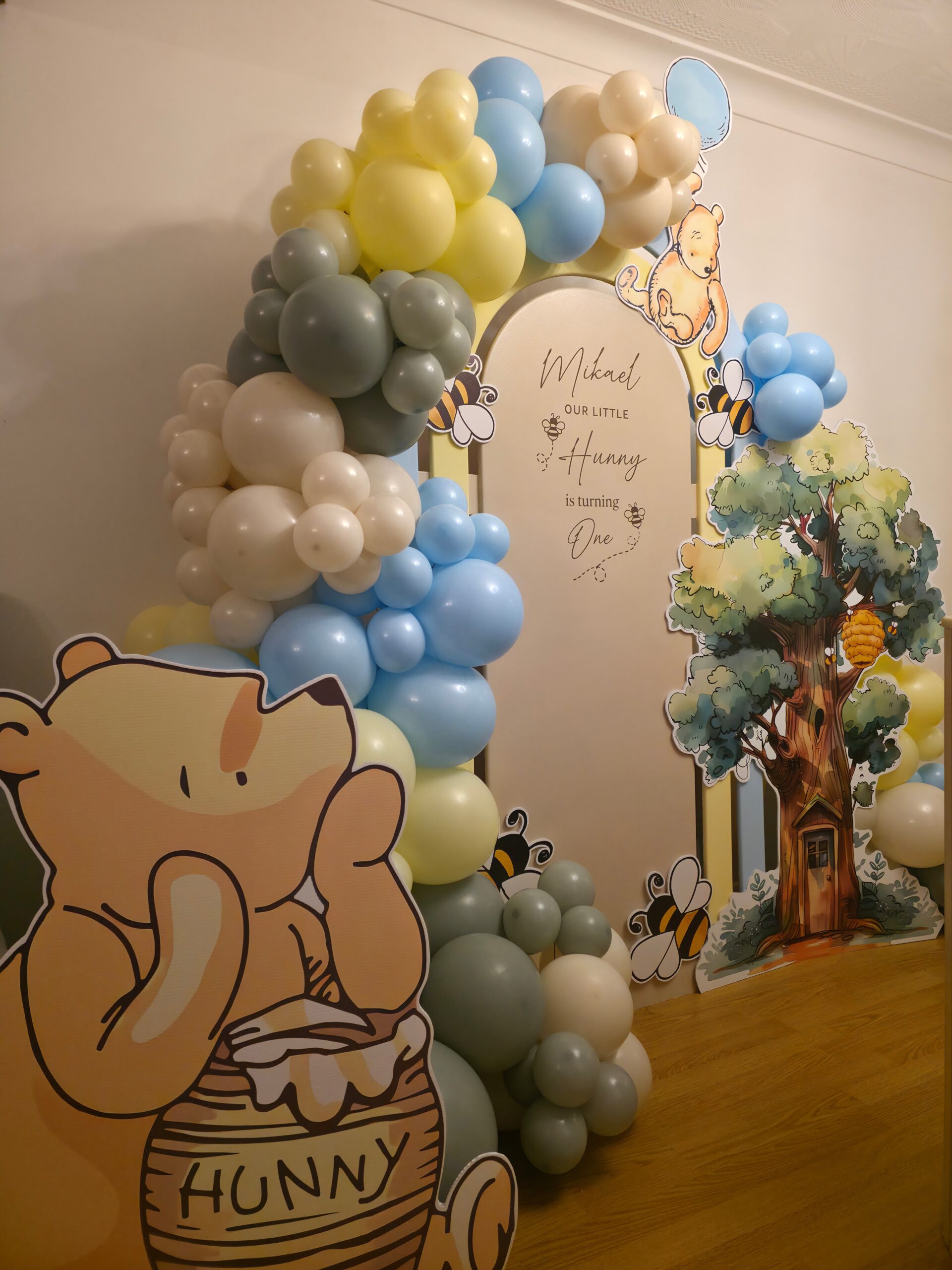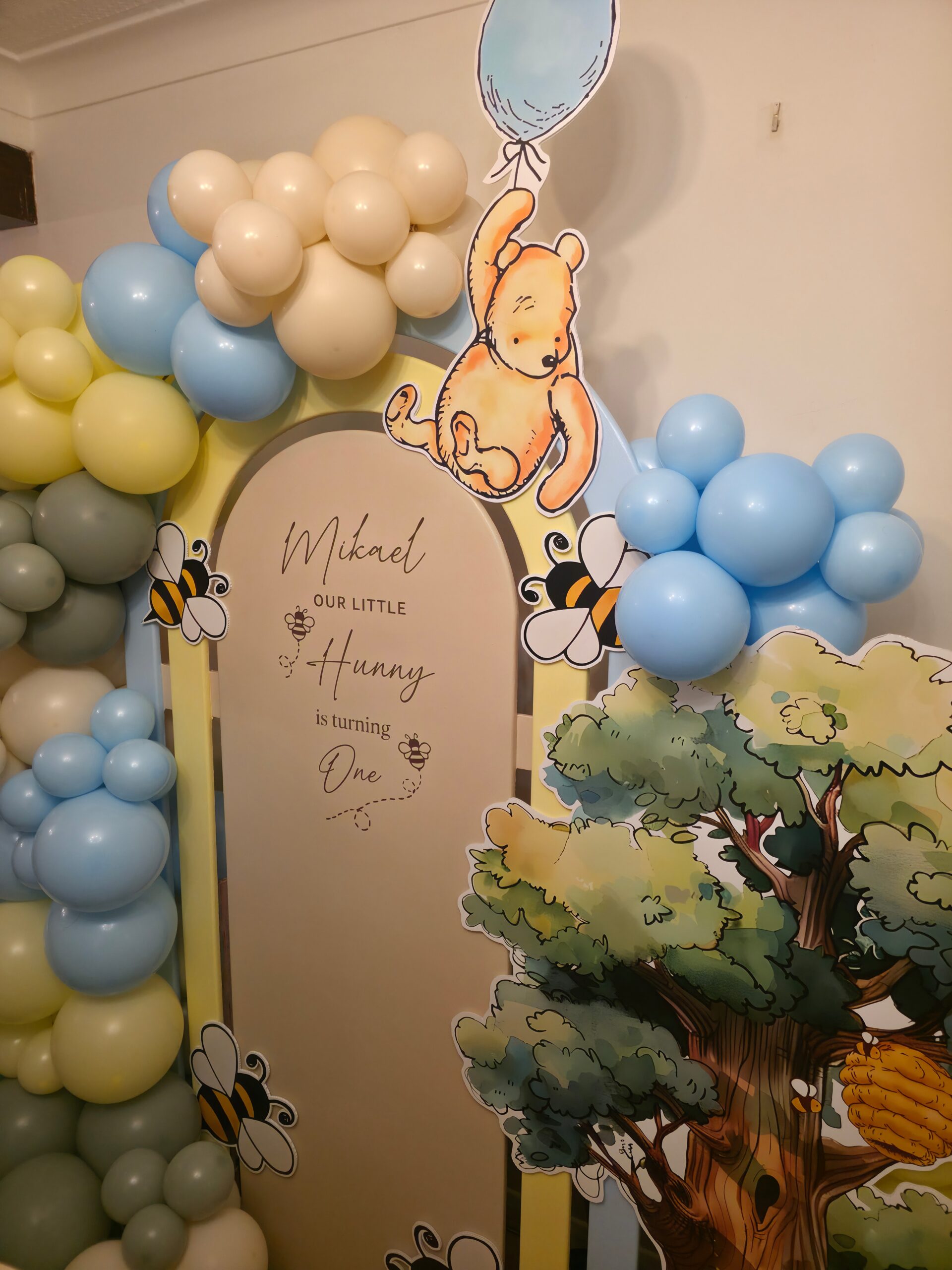 The main feature was a personalised arch backdrop, styled with a bespoke balloon garland in shades of baby blue, soft yellow, sage and ivory. Classic Winnie the Pooh character cut-outs, buzzing bees and woodland elements were carefully placed to bring the theme to life, creating a fun and engaging backdrop for photos and memories.