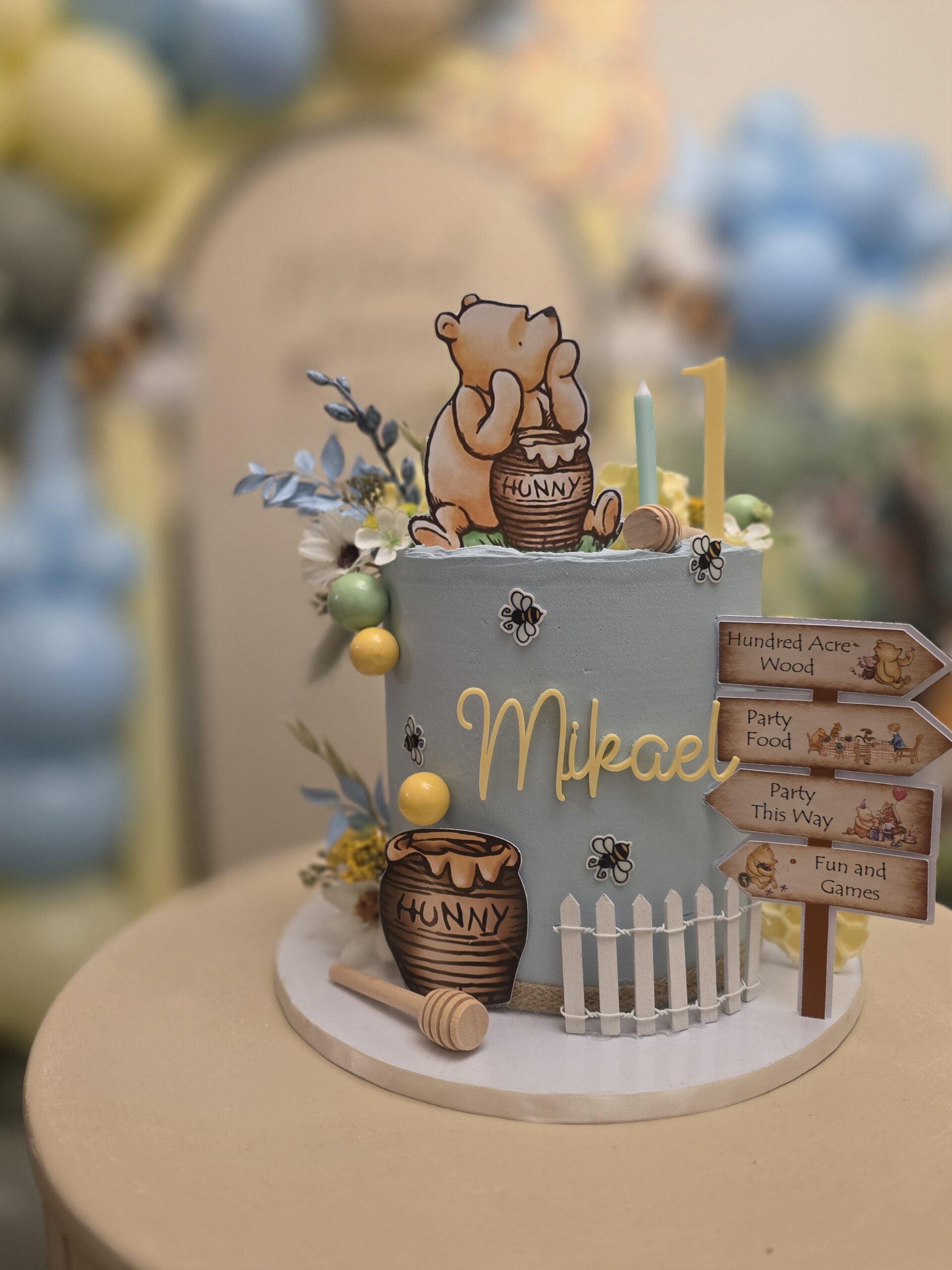 A dedicated cake display completed the setup, featuring a beautifully styled Winnie the Pooh cake with honey pot details and personalised name accents. Every element was thoughtfully coordinated to ensure the decor felt cohesive, charming and age-appropriate, while still making a strong visual impact.